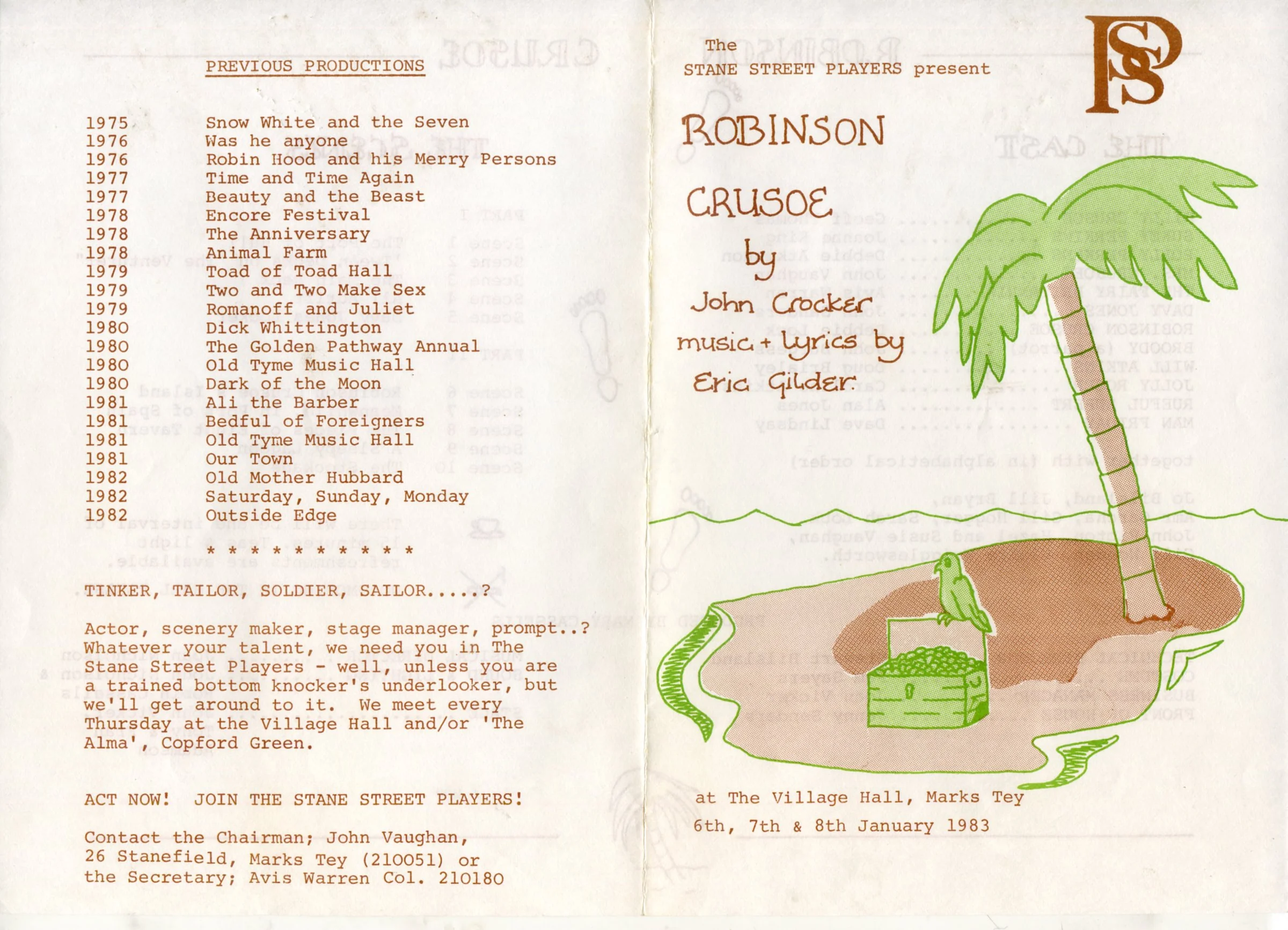 The programme for the Stane Street Players pantomime, Robinson Crusoe, held in the old village hall in Marks Tey on 6, 7 & 8 January 1983.