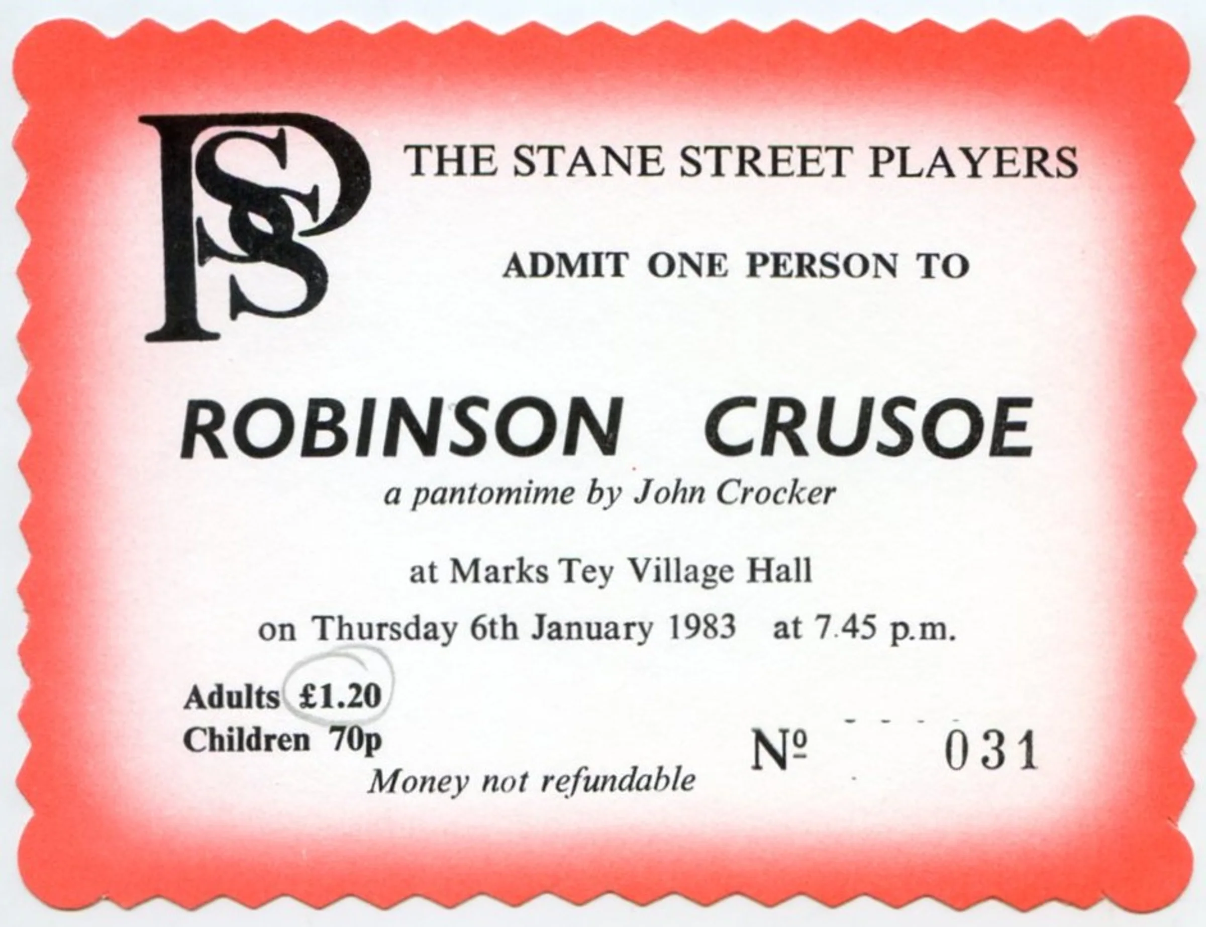 A ticket for the Stane Street Players pantomine, Robinson Crusoe performed on 6 January 1983.