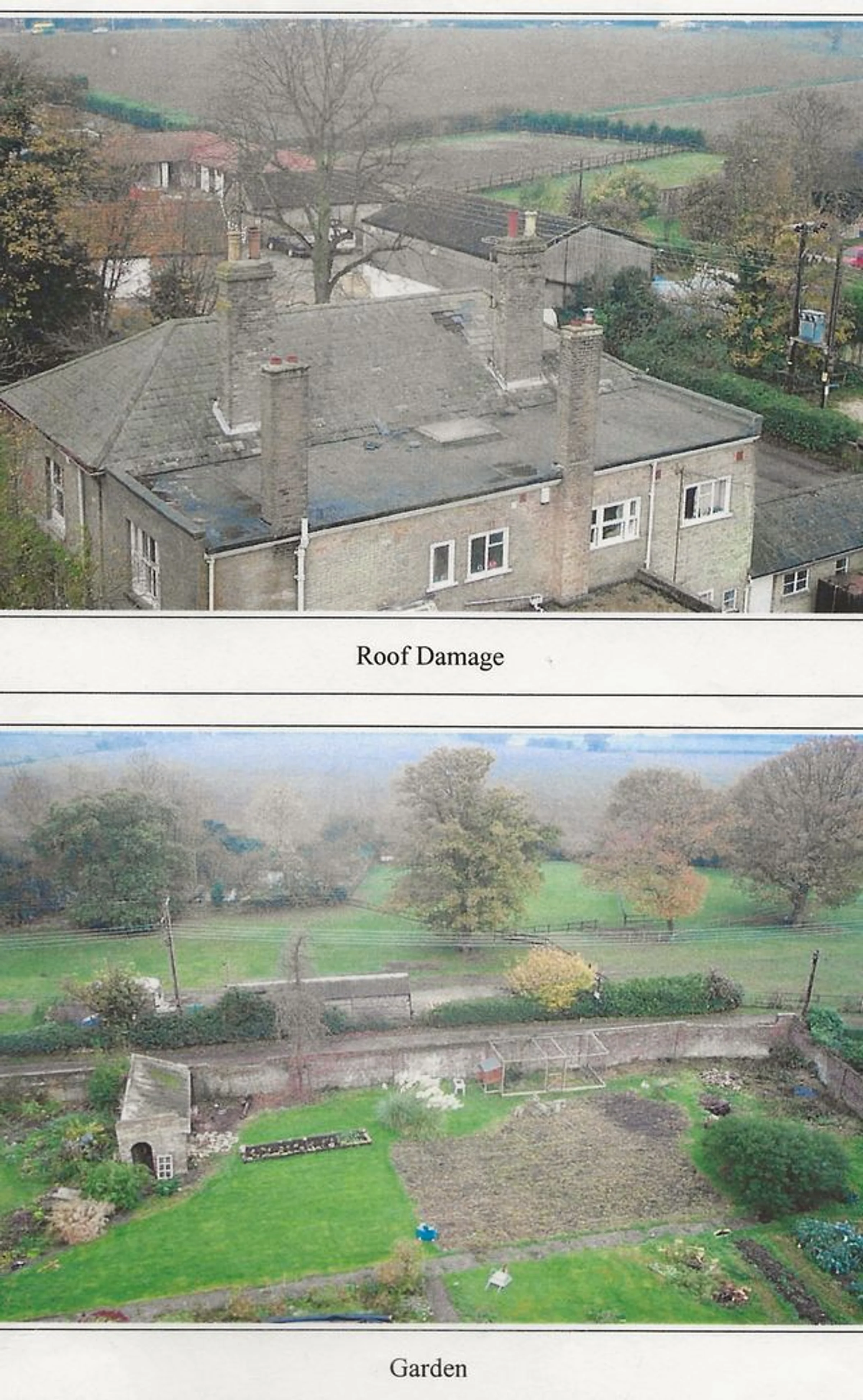 Two photographs relating to the Rectory. The first shows roof damage looking southwest and includes Church Farm beyond. The second is a view of the garden from the Rectory roof.