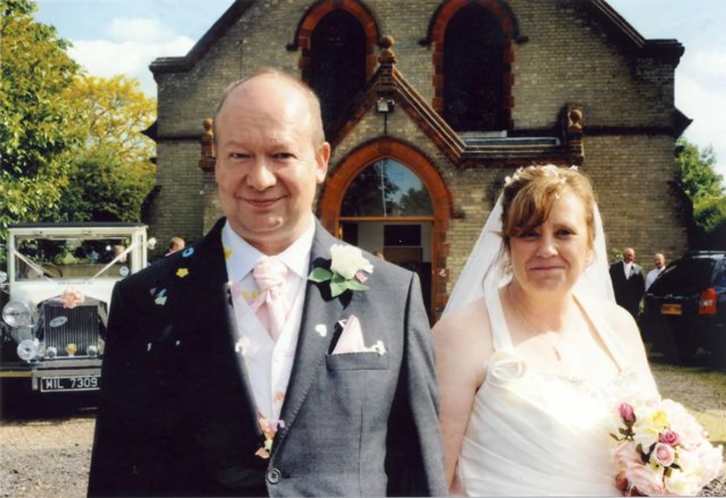 Sandra and Mark outside the Methodist Church after their wedding. The date was 13 June but the year and surnames were not with the labelling.