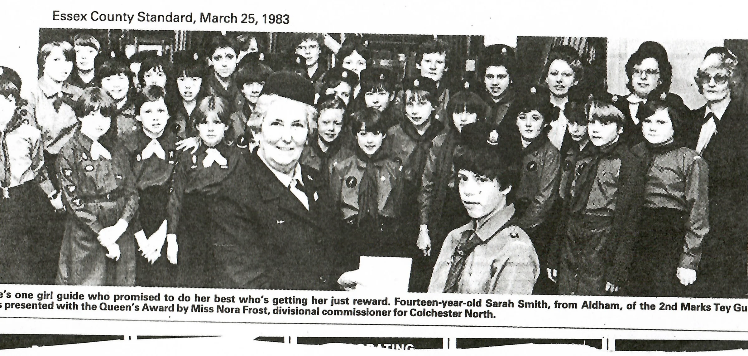 Here's one girl guide who promised to do her best who's getting her just reward. Fourteen-year-old Sarah Smith, from Aldham, of the 2nd Marks Tey Guides, was presented with the Queen's Award by Miss Nora Frost, divisional commissioner for Colchester North.
