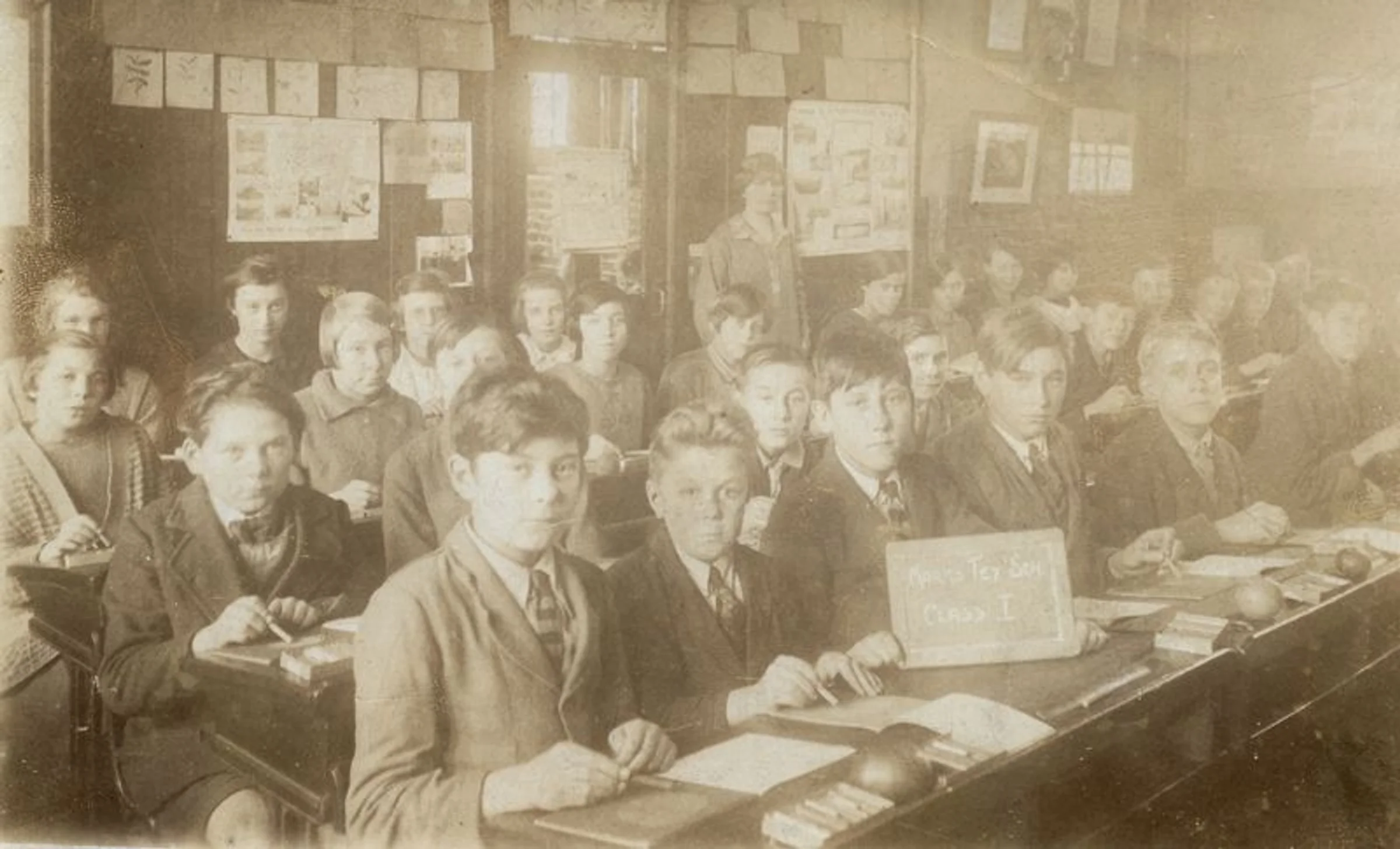 An unlabelled photo from the Polley family showing older children in a classroom. This is likely be an image of Marks Tey School.