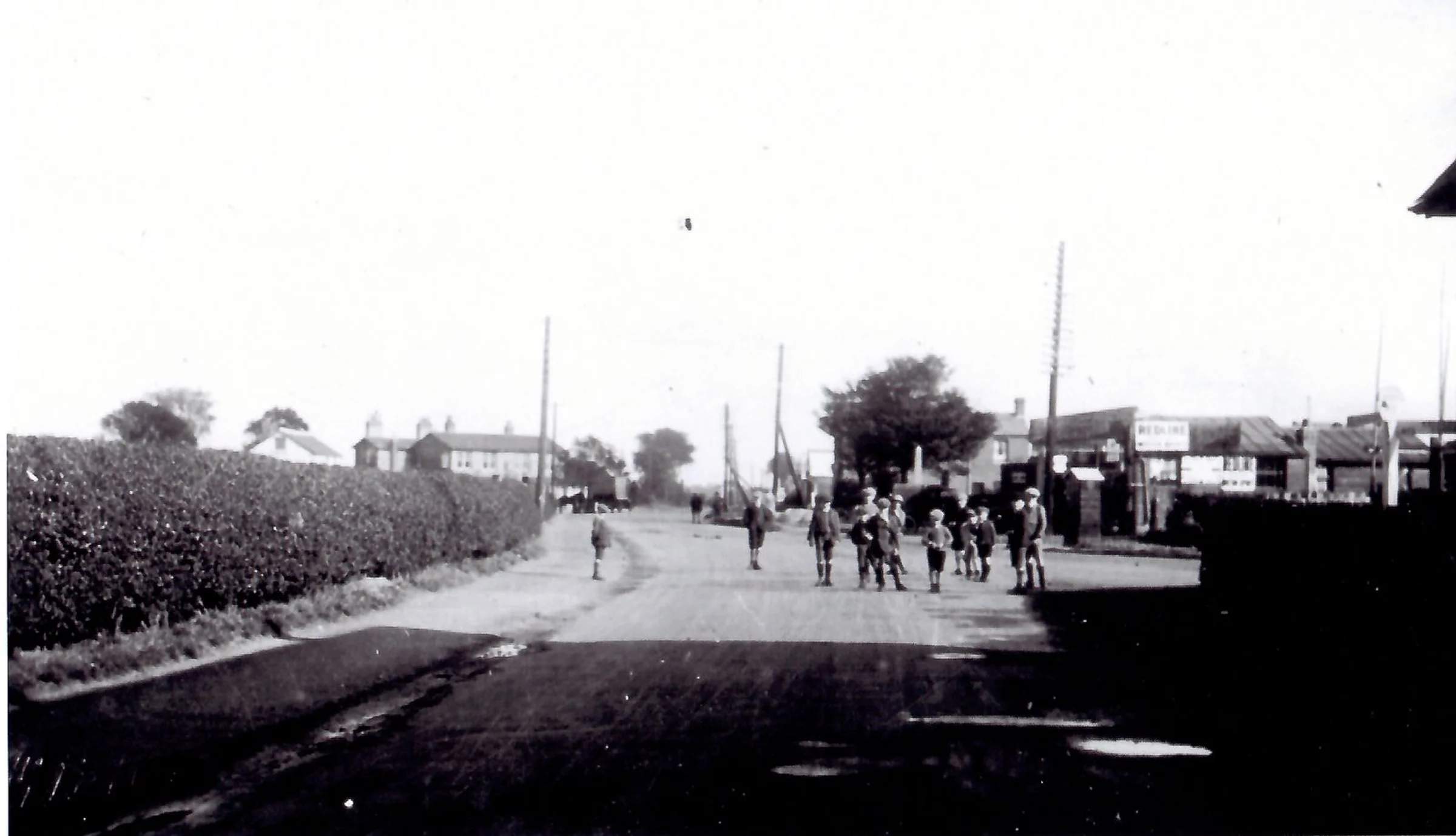 Undated photo of schoolchildren just outside their school which is on the right side. The photograph is taken from Coggeshall Road looking down into London Road and the shops there. The war memorial is visible behind the children. The old Prince of Wales pub is on the left at the junction with Station Road.