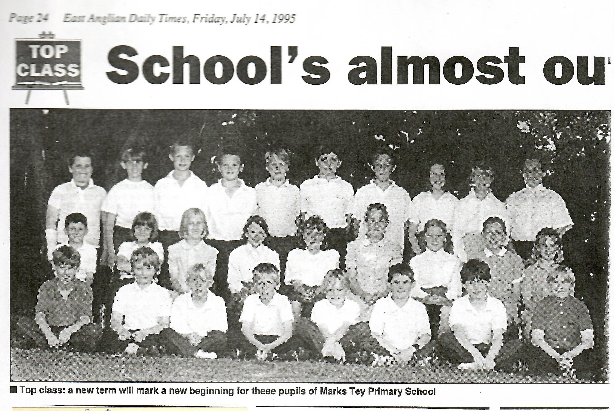 The newspaper clipping features celebrating pupils of Marks Tey Primary School at the close of the academic year.
