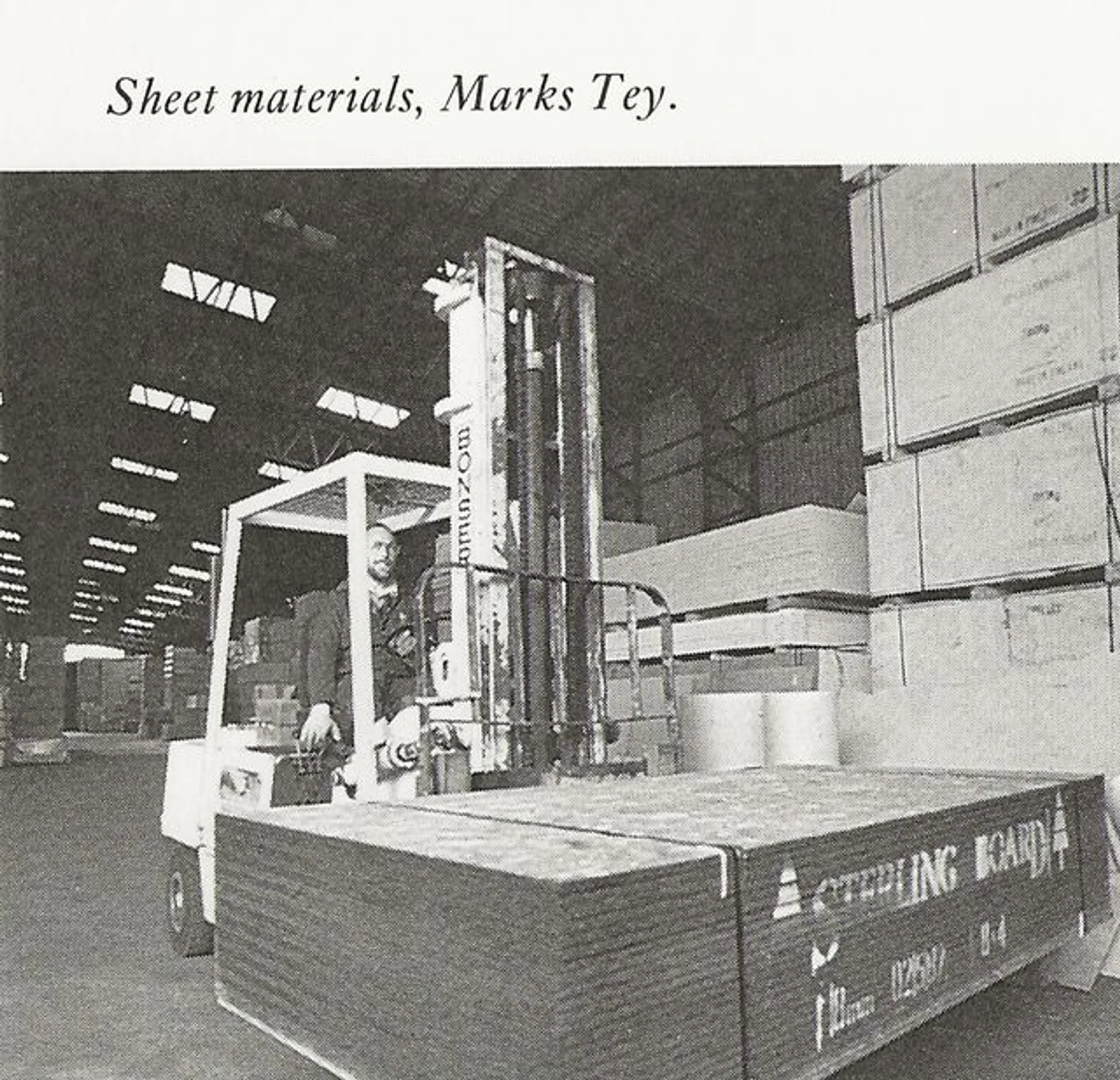 A man moving a pile of boards with a fork lift truck in the sheet material warehouse at Andersons.