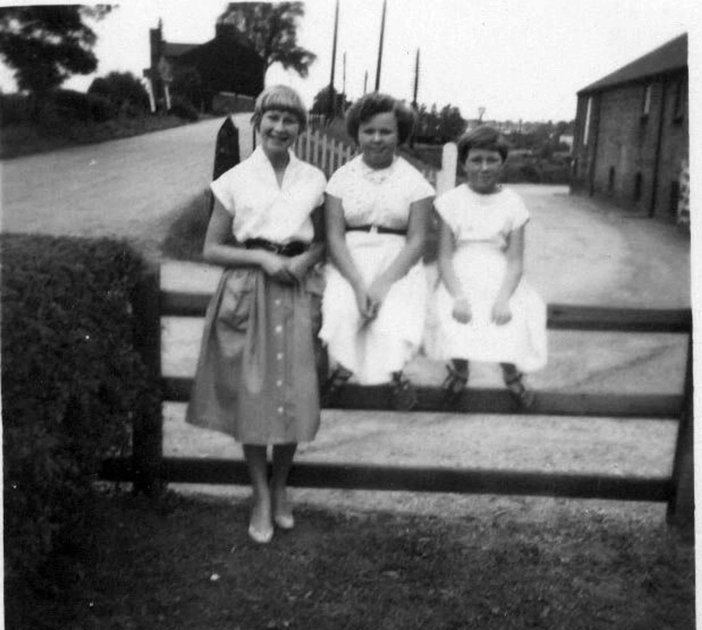 Sheila Wilby with girls Julia Wisbey and Sandra Wilby standing by the gate next to the old maltings which was used by Folkards Seeds.