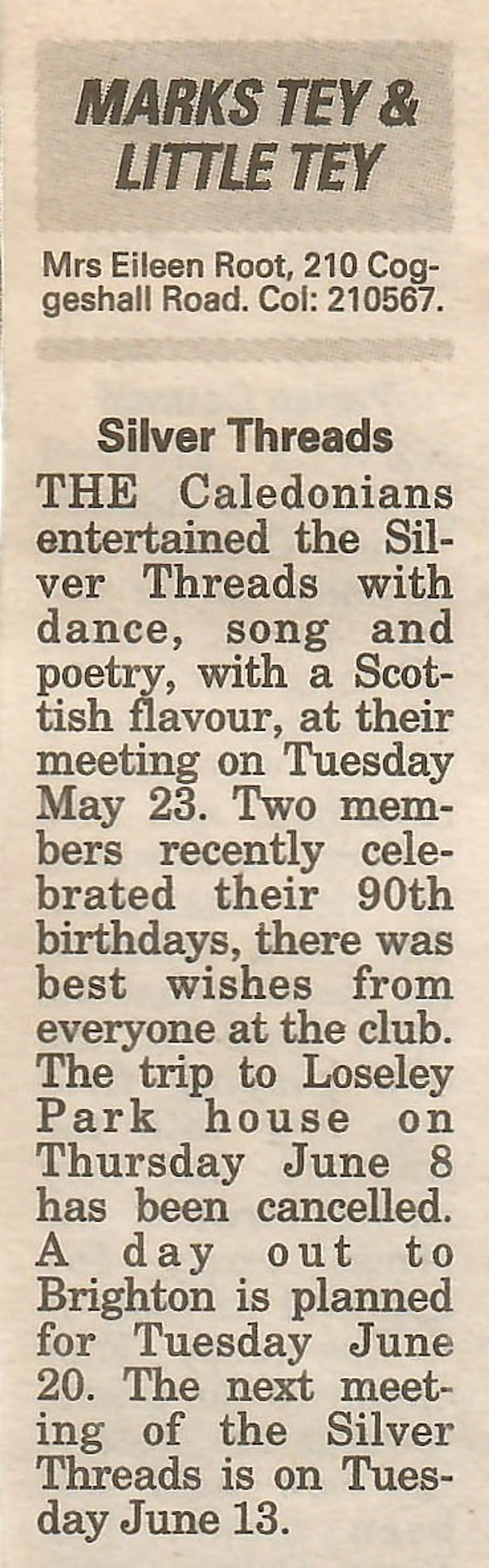 Village newspaper column reporting on the May meeting of the Silver Threads.