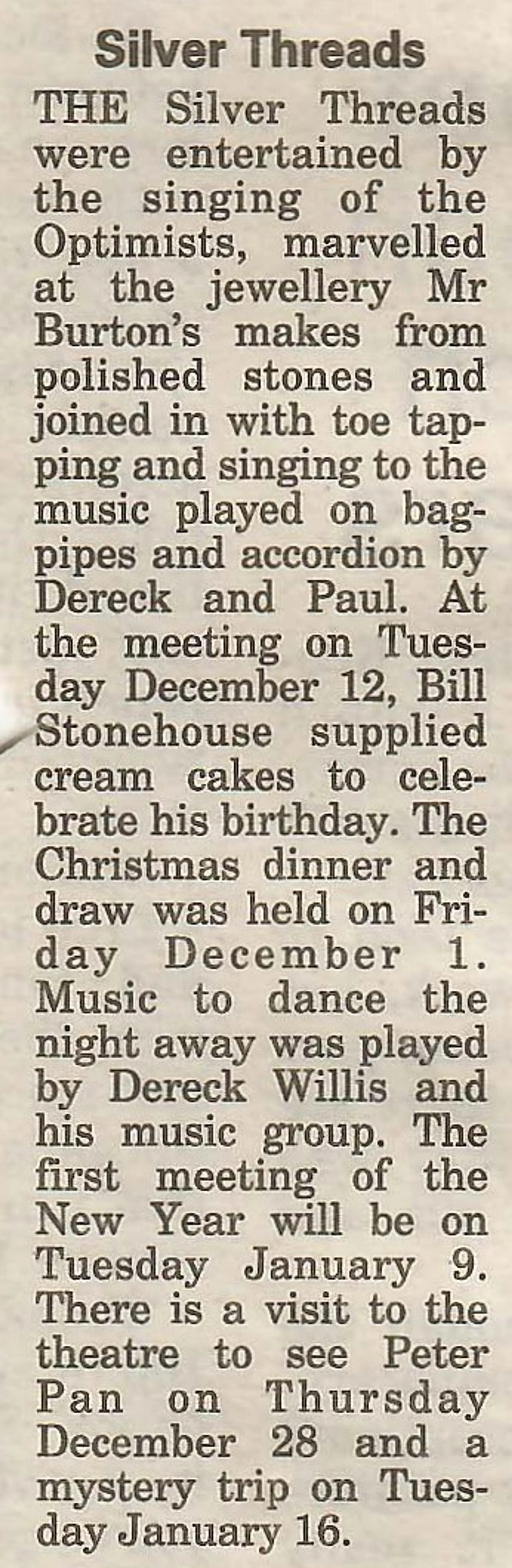 Village newspaper column reporting on the December meeting of the Silver Threads.