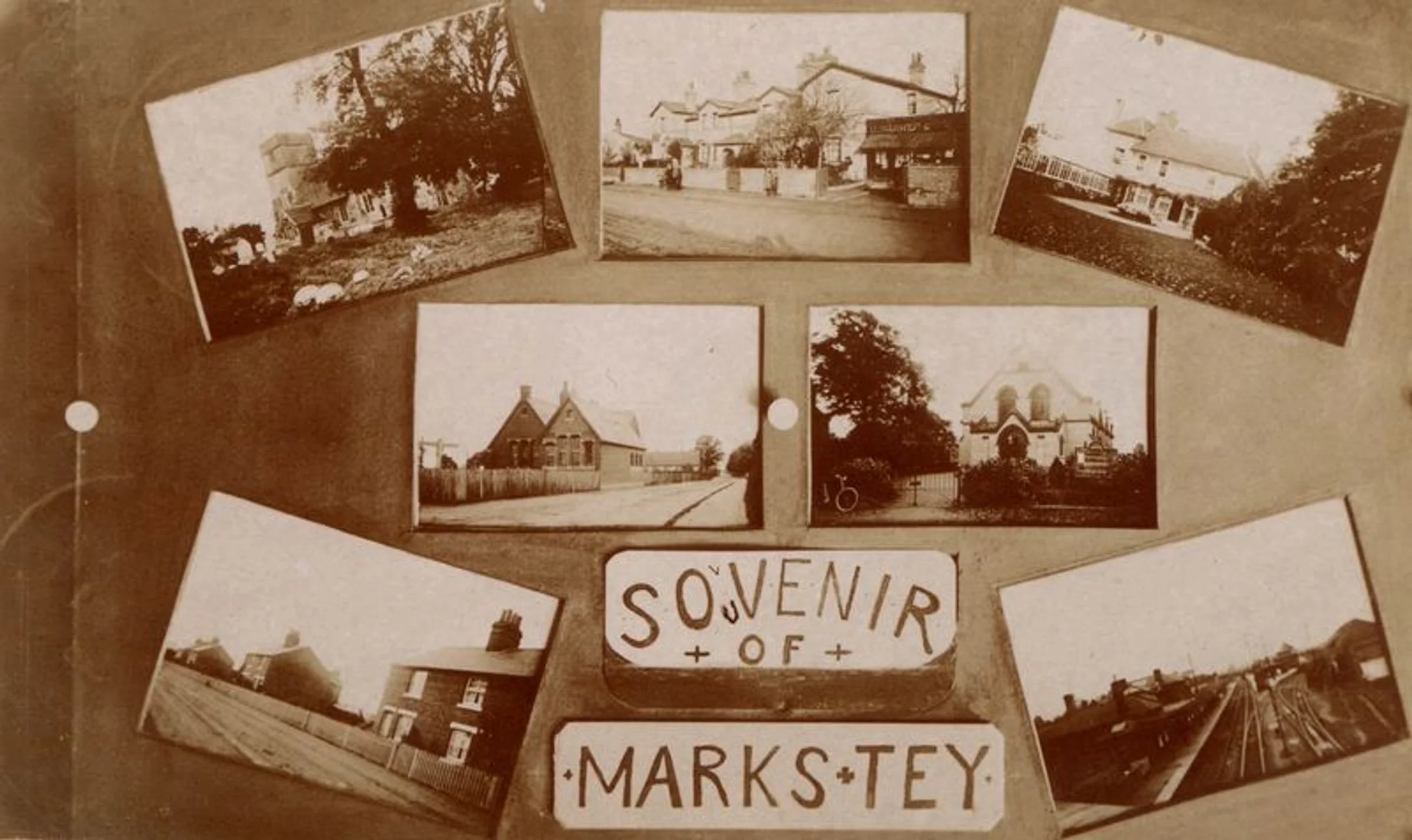 A display of seven postcards depicting a various views of Marks Tey entitled "Souvenir of Marks Tey" and belonging to the Polley family. The postcard views include St Andrew's church, the Methodist church, the railway station from the bridge, the old school, the old rectory and Coggeshall Road and Station Road.