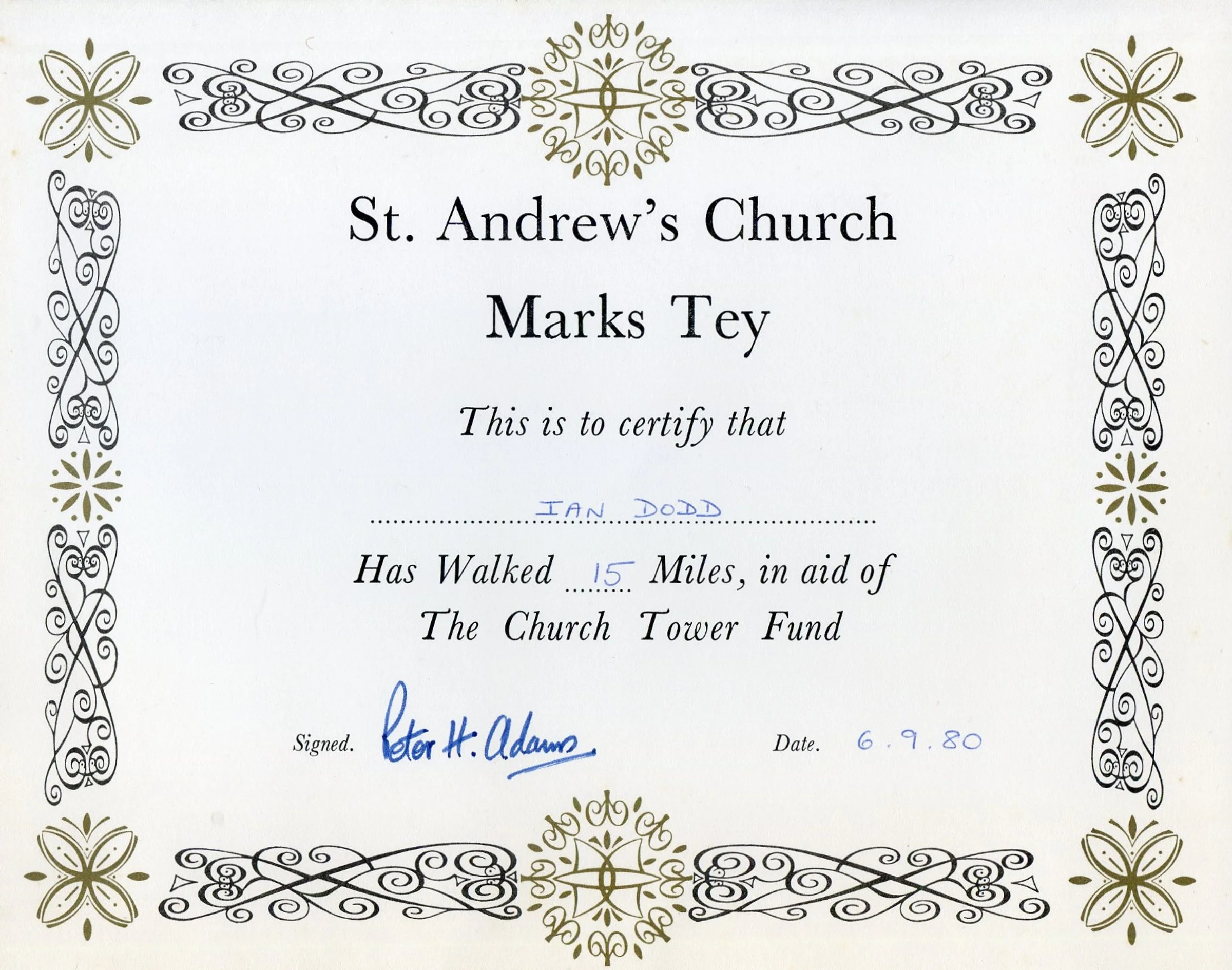A certificate signed by Rev Peter Adams to say that Ian Dodd had walked 15 miles on 6 September 1980 in aid of The Church Tower Fund.