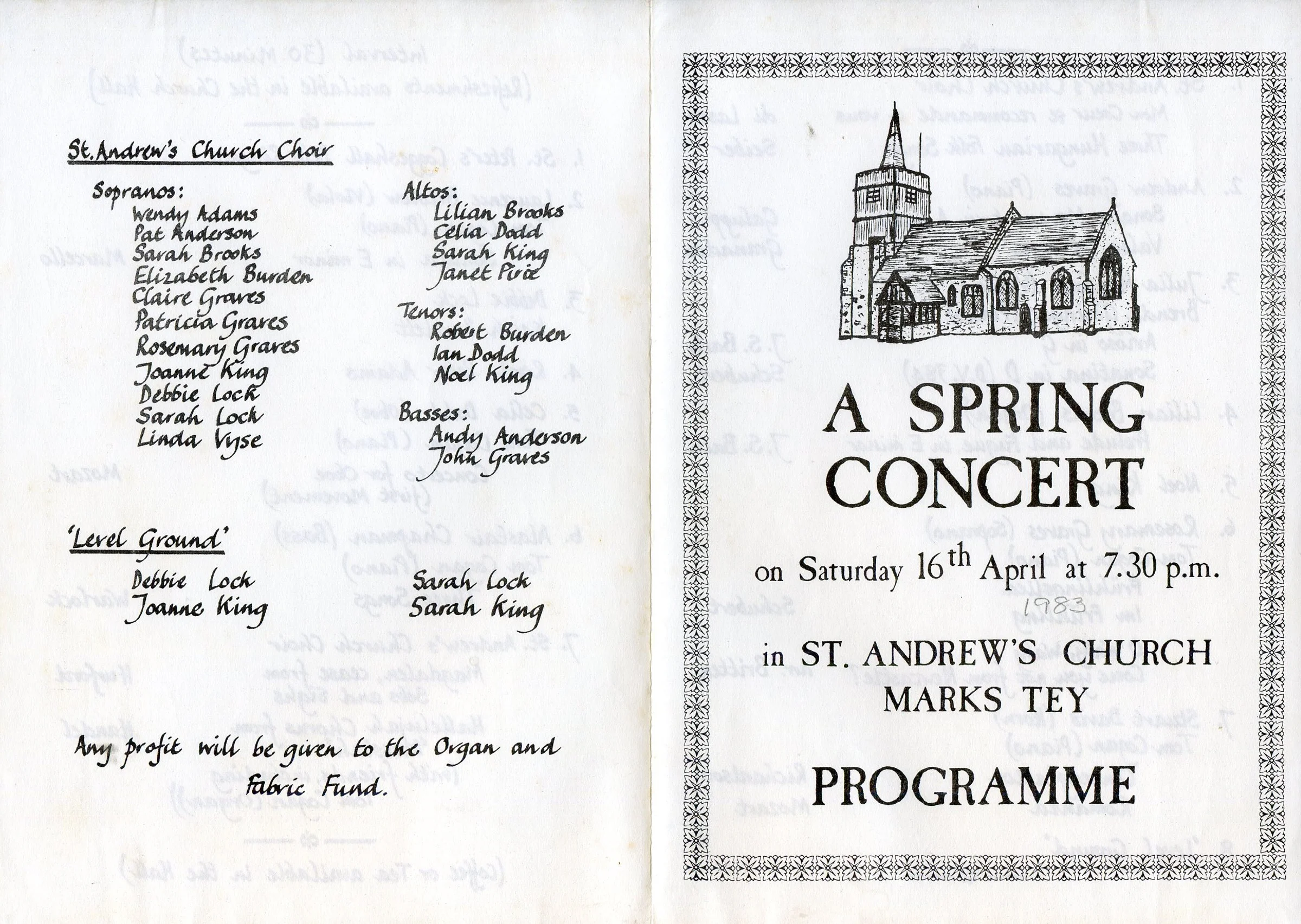 Both sides of the programme for the Spring Concert at Marks Tey church held on 16 April 1983.
