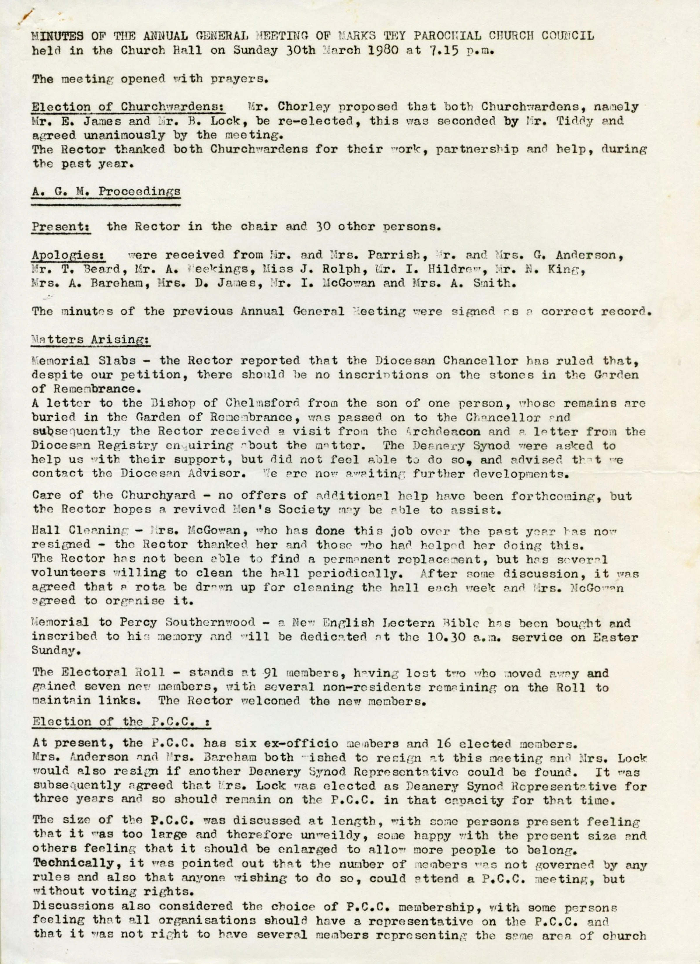 Minutes from the Annual General Meeting of the Parochial Church Council, 30th March 1980. Page 1 of 4.