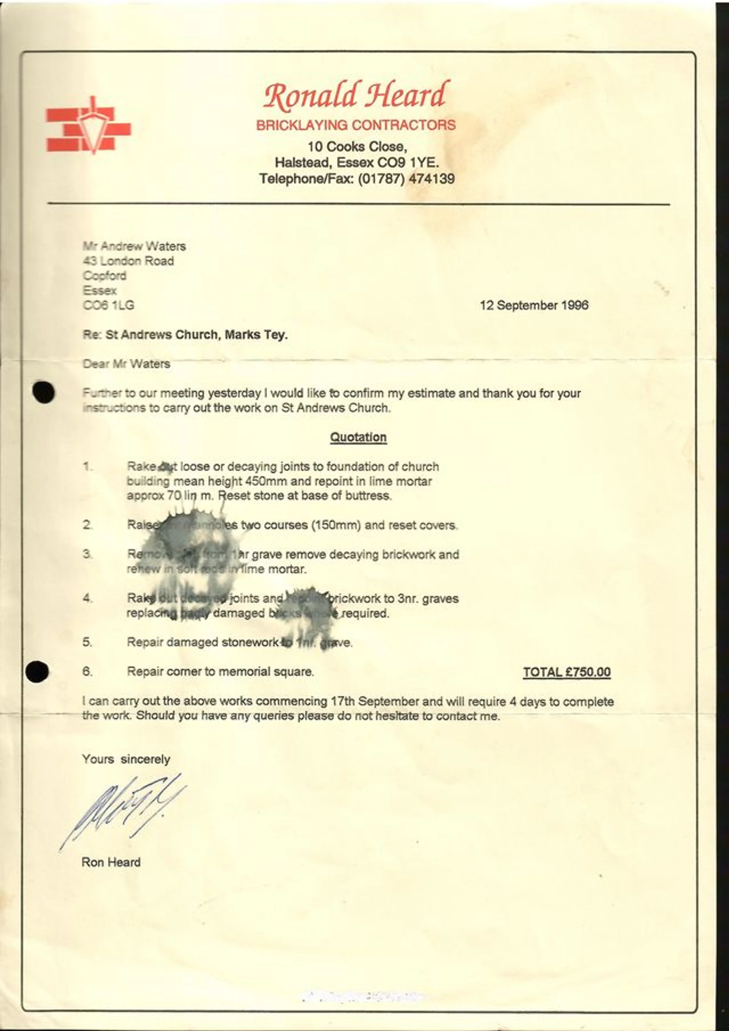 Quotation from Ronald Heard Bricklaying Contractors for work at St Andrew's Church, 12th September 1996.