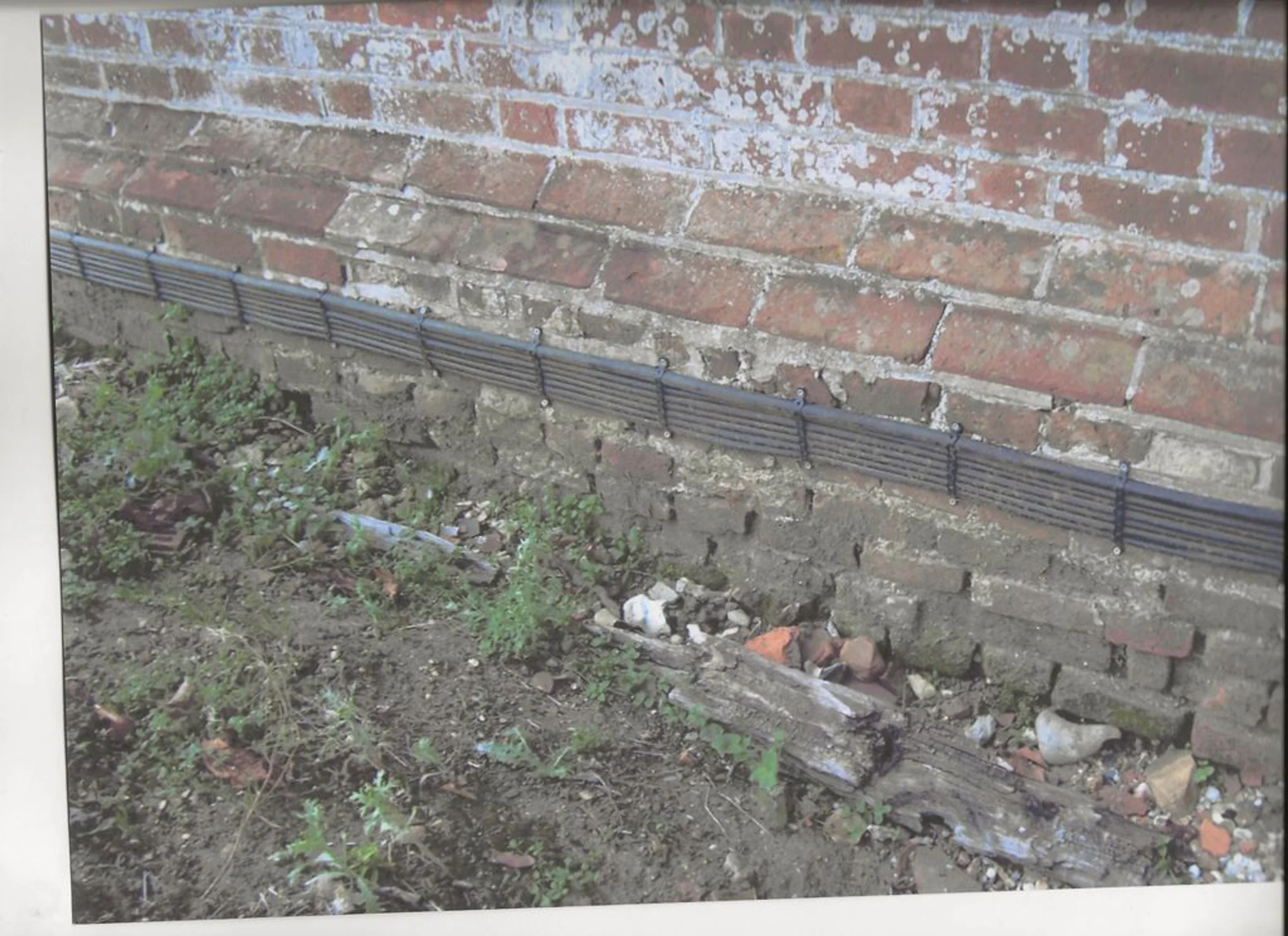 Close up photograph of black cables at the base of a brick wall at St Andrew's Church.