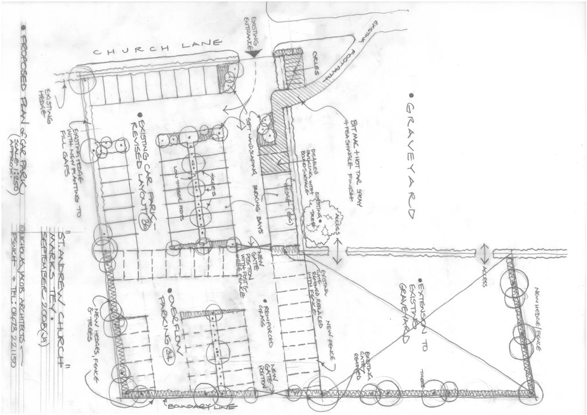 Plan of the proposed car park upgrade, marking an overflow parking area and extension to the graveyard. By Nicholas Jacob Architects, September 2008.