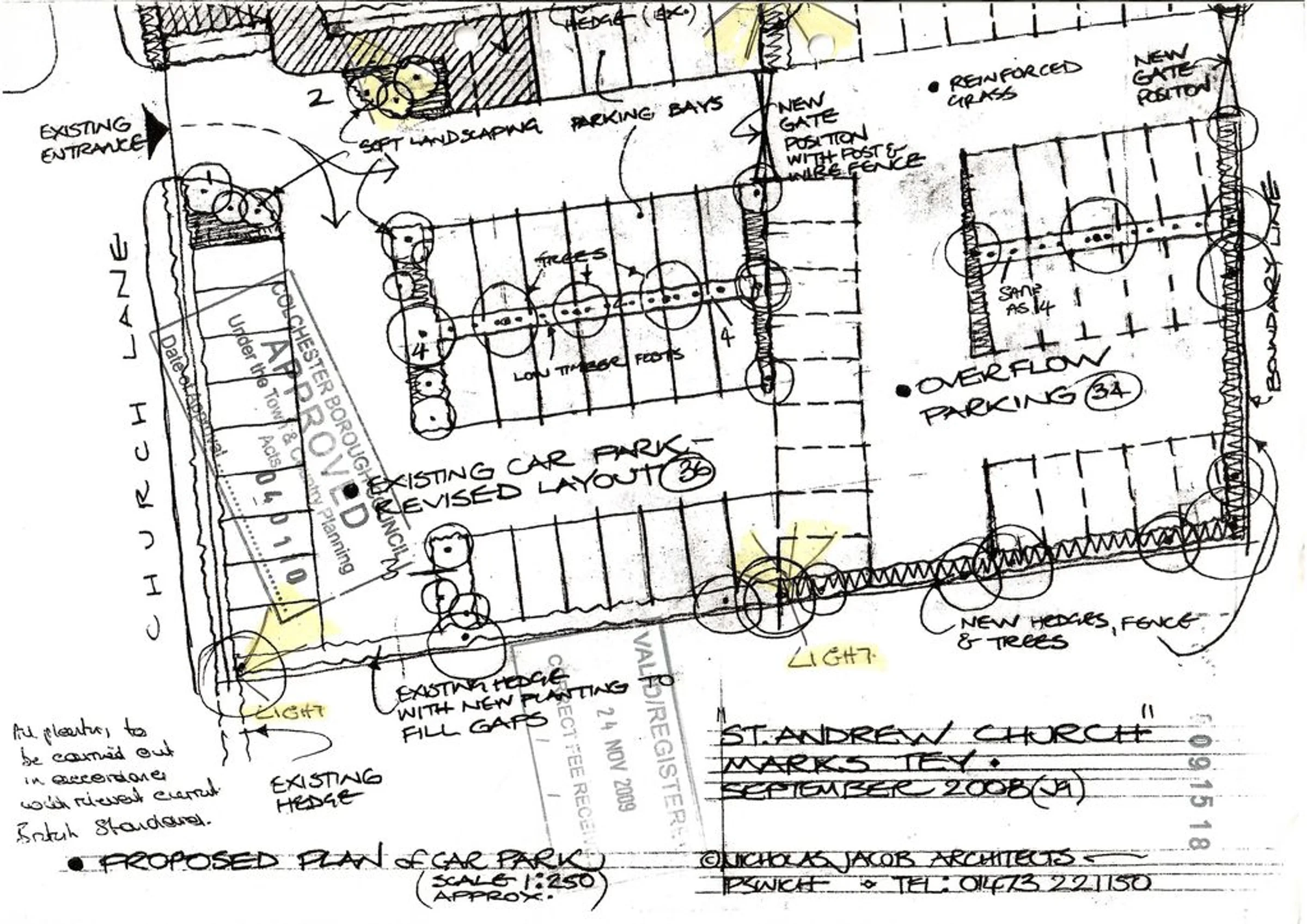 Architect's plan of the proposed car park extension and lighting scheme, dated September 2008. Page 2 of 2.