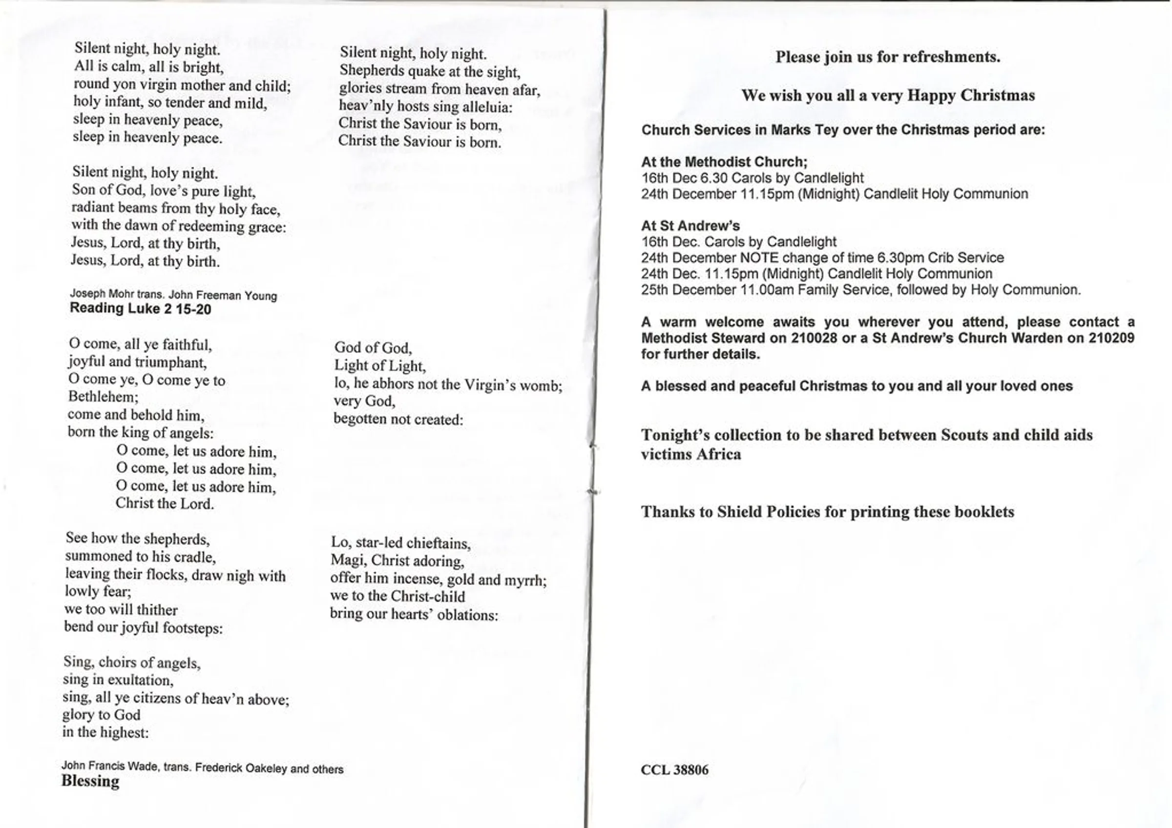 Service sheet from the Parish Carol Service in the Millennium Garden, Parish Hall in 2001. Page 4 of 4.