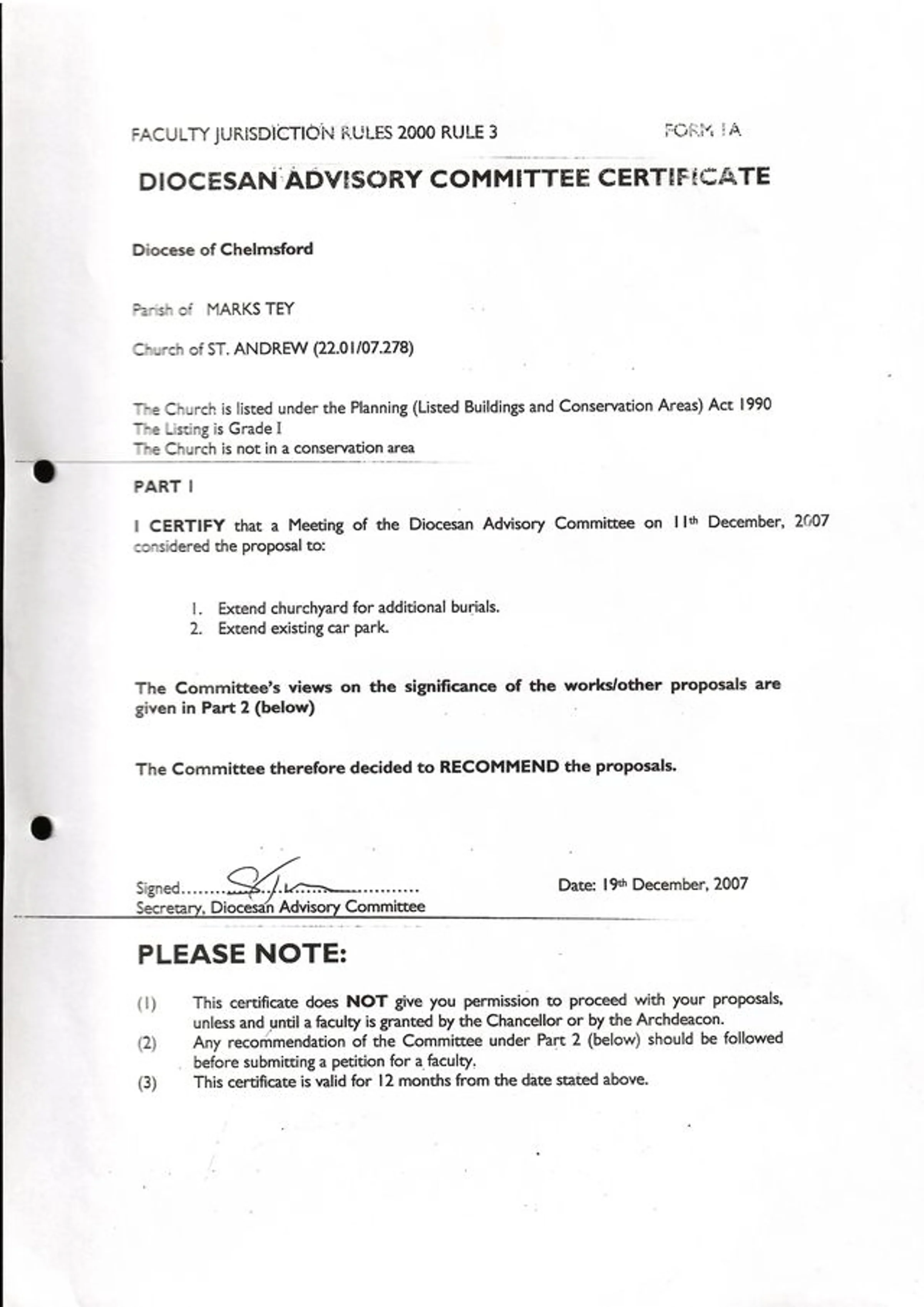 Diocesan Advisory Committee Certificate giving permission to extend the churchyard and the car park, dated 19th December 2007.