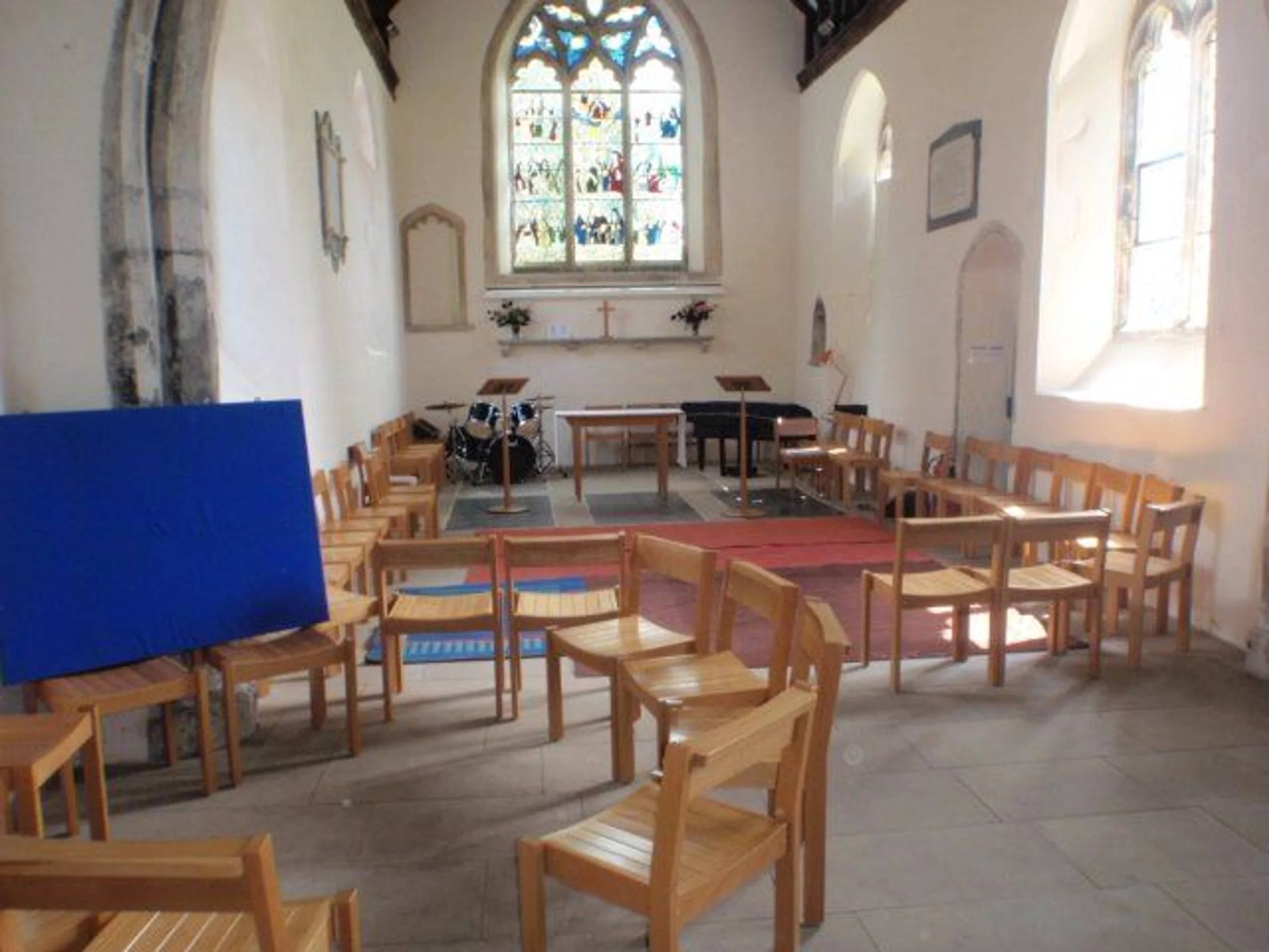 Photograph of the interior of the chancel following reordering, with chairs flexibly using the space, looking east.