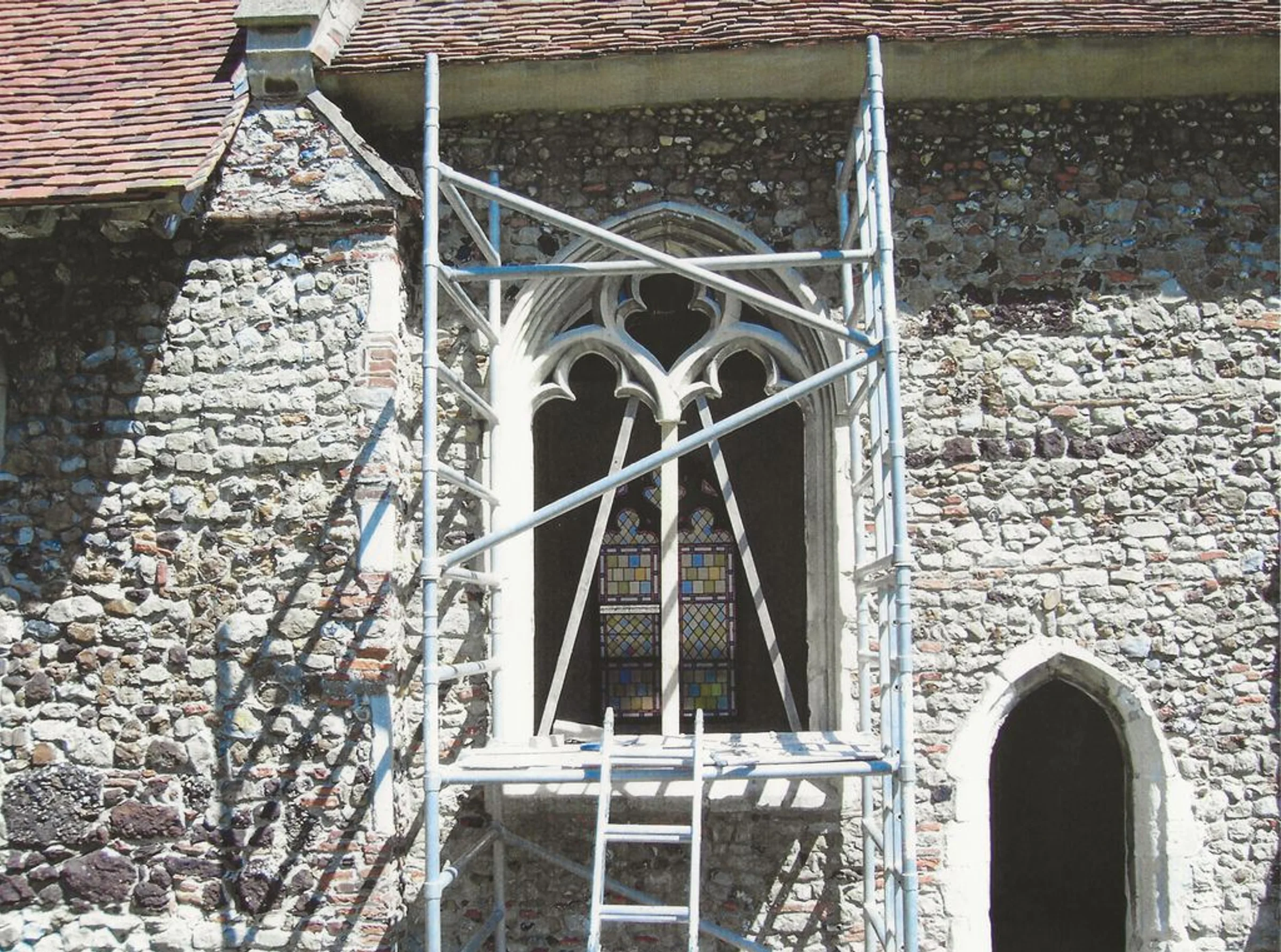Photograph looking north of scaffolding around the window in the south chancel wall prior to the reinstallation of glass, during 2007 reordering.