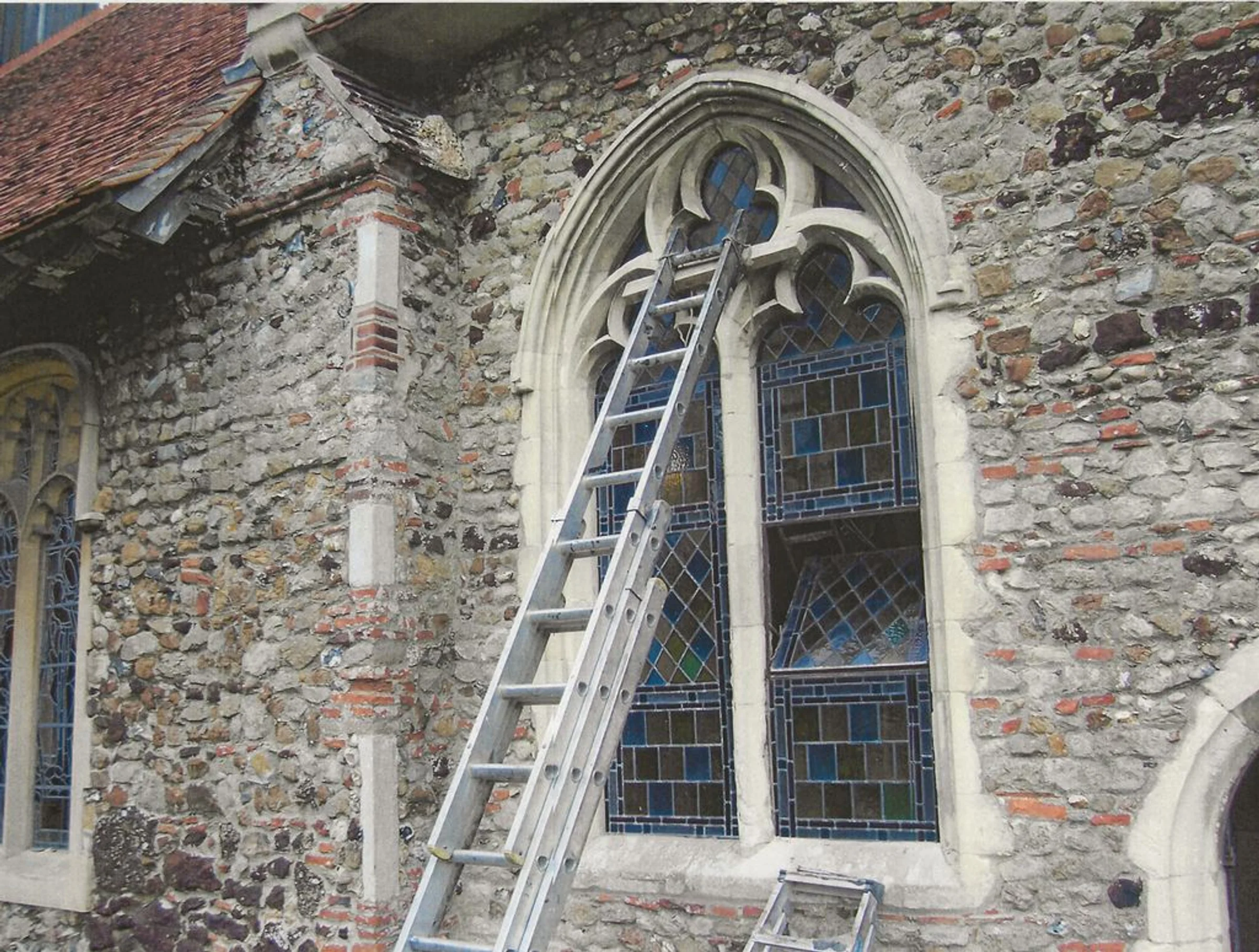 Photograph looking north of repair to a stained glass window in the chancel external wall, during 2007 reordering.