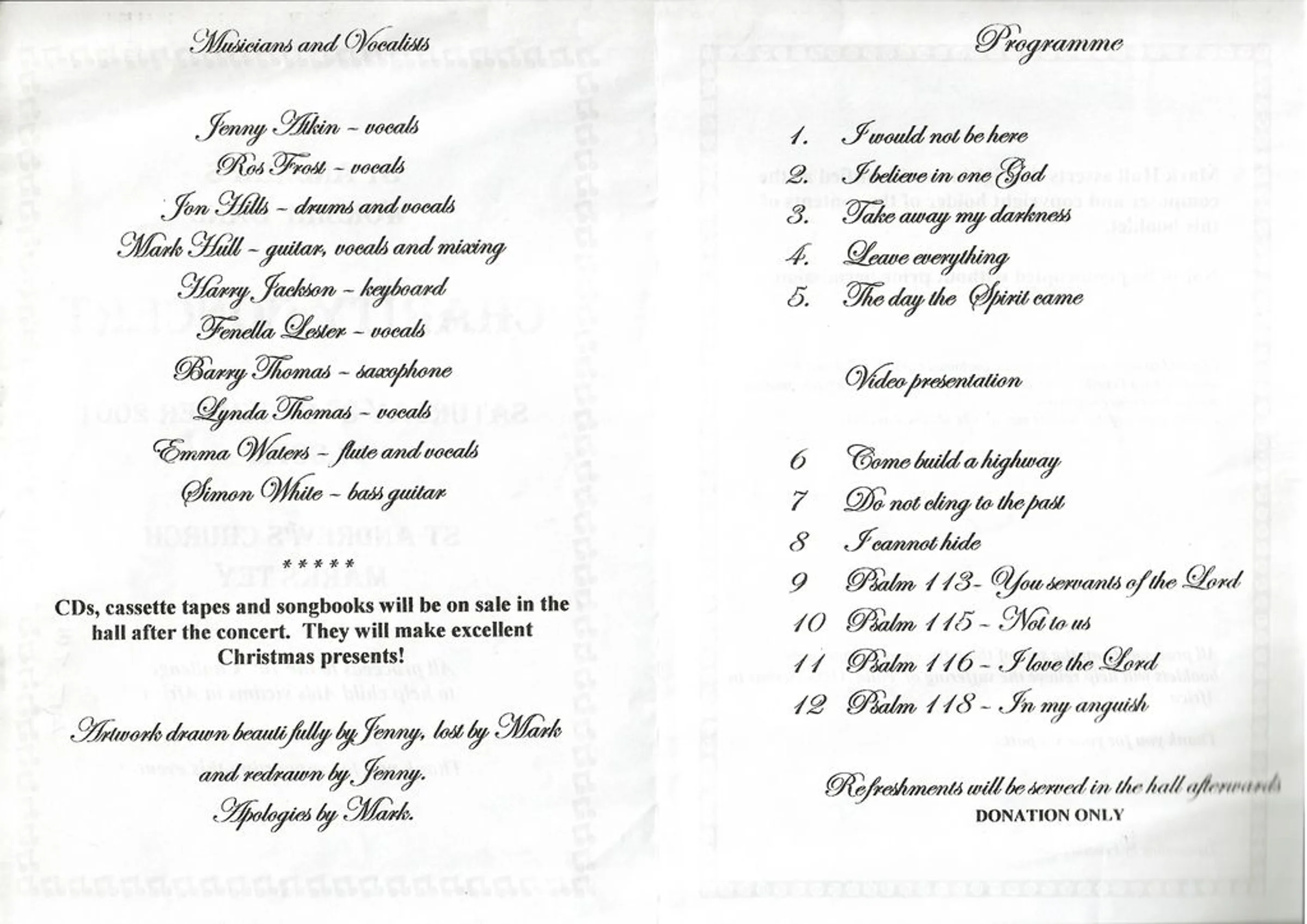 Programme from a Charity Concert given by the St Andrew's Worship Band on 8th December 2001. Page 2 of 2.