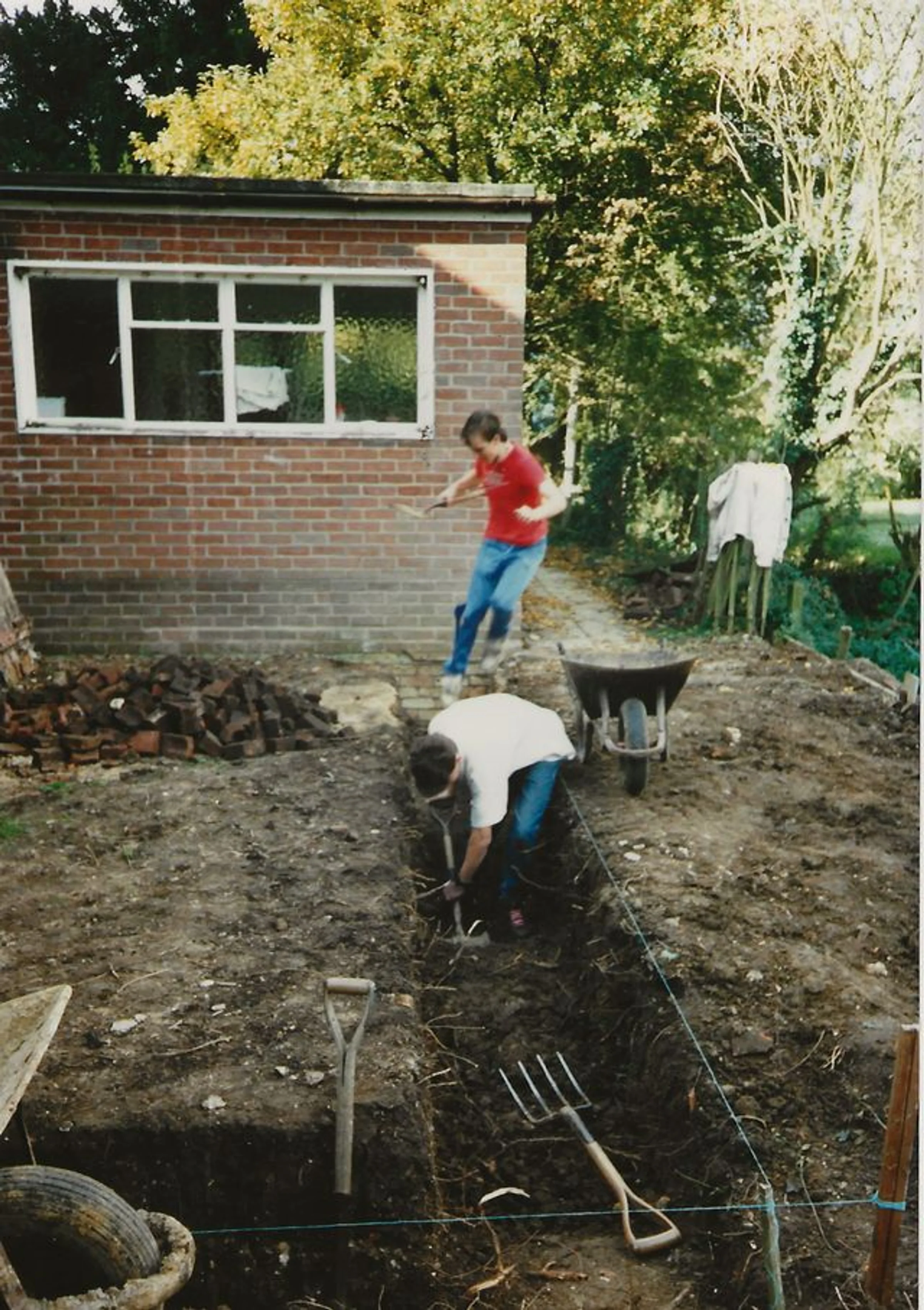 Photograph of work in progress during excavation of trenches adjacent to the wall of Church Hall. Unknown date.