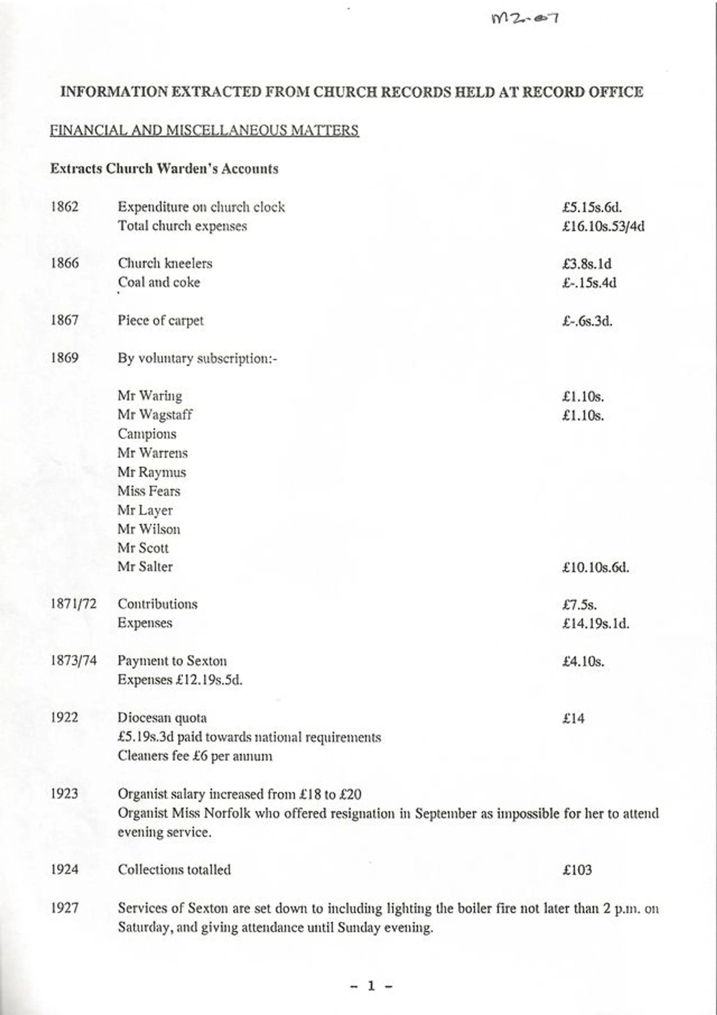 Transcript of extracts from the churchwarden's accounts between 1862 and 1927.