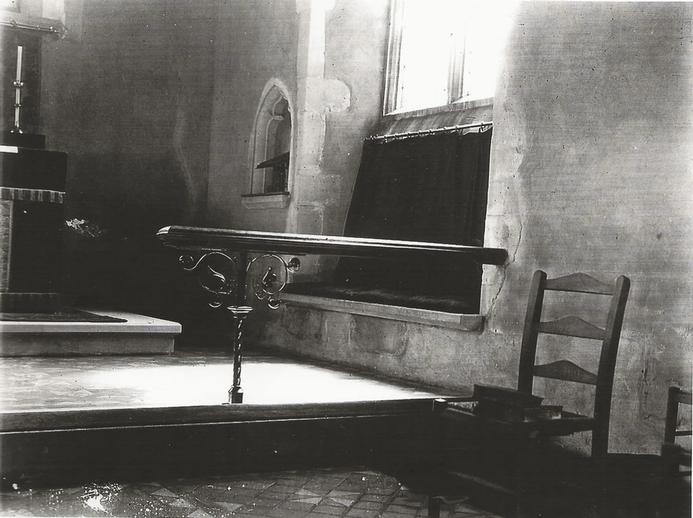 Black and white photograph of a section of communion rail and sanctuary. Taken in 1925 and held by the National Monuments Record.