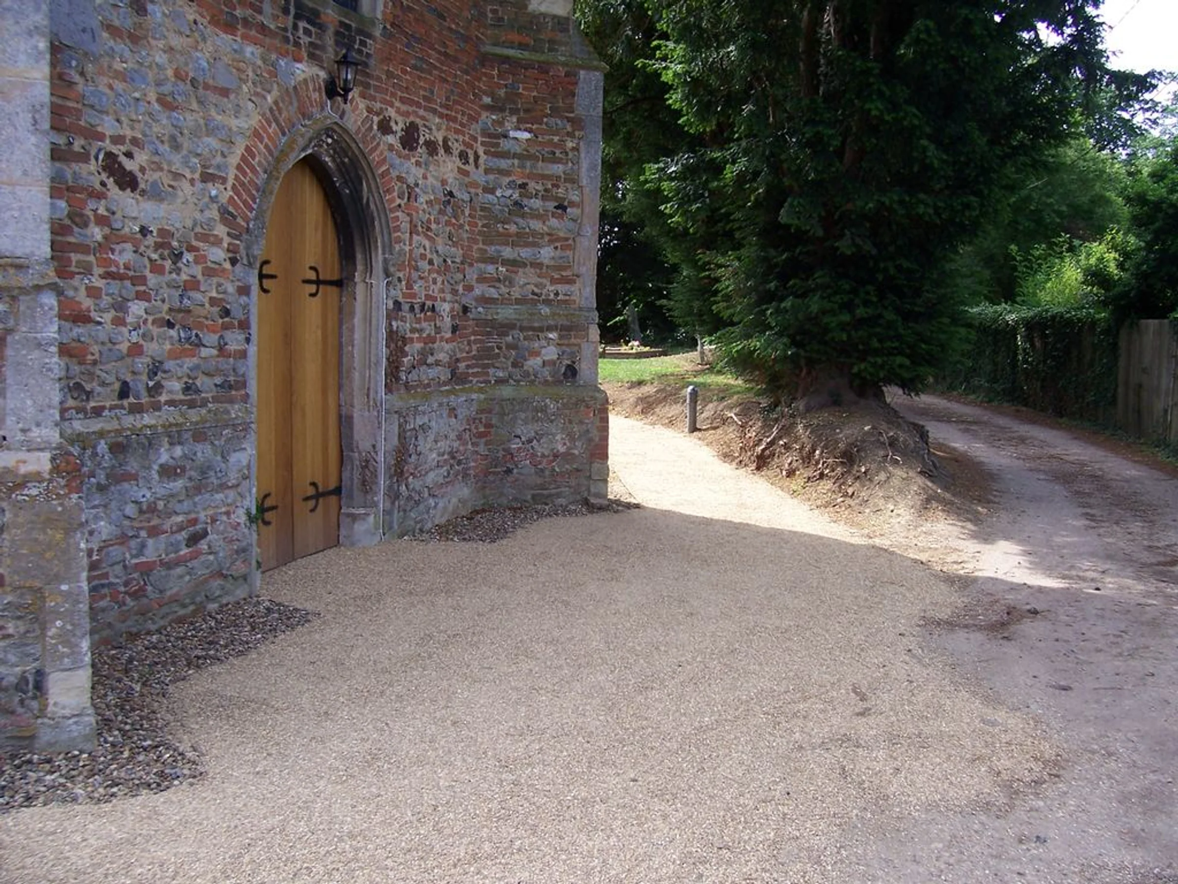 Photograph looking south of the completed path around the tower to the porch and the gravelled area outside the west door, part of the 2007 reordering.