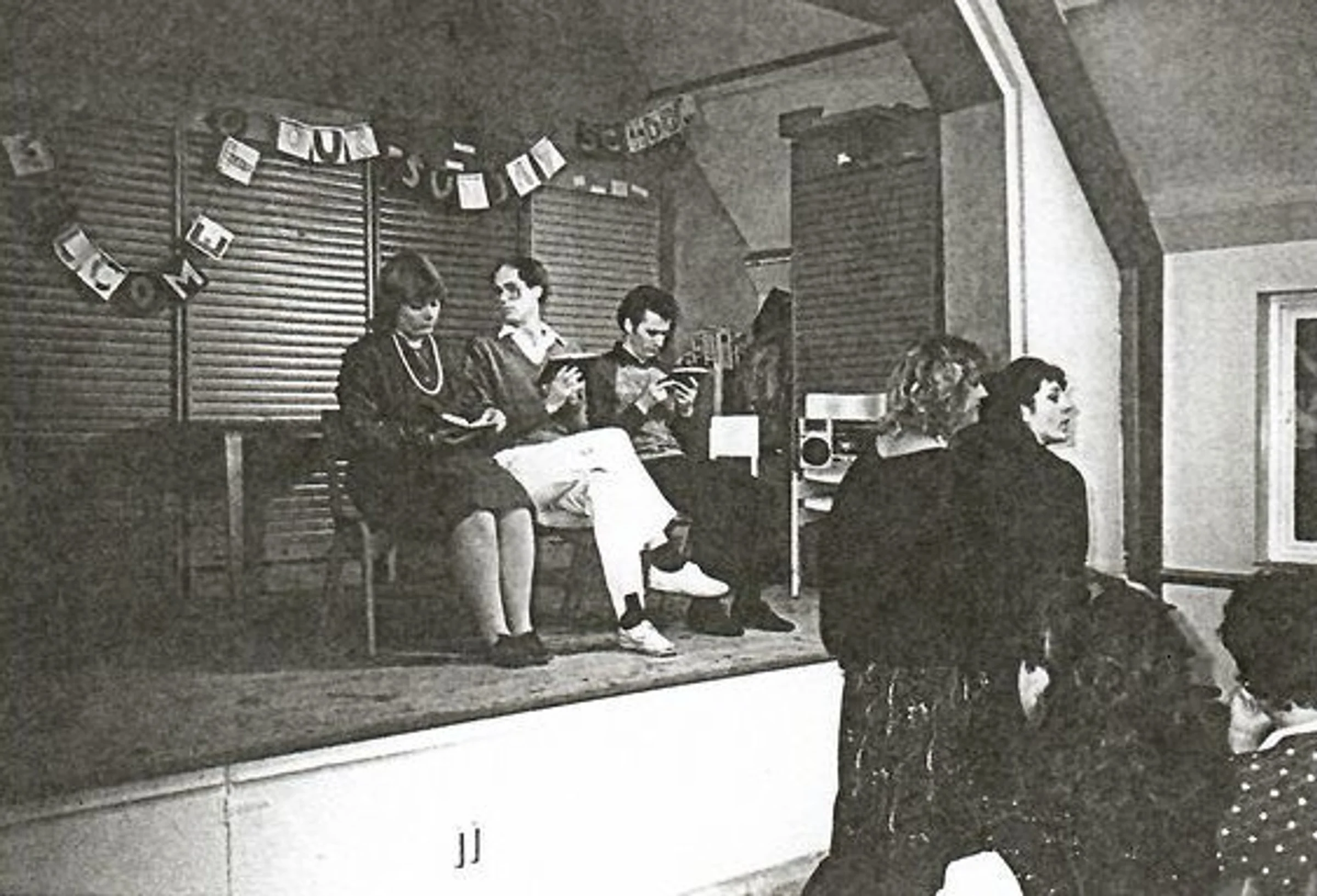 Black and white photograph of the Covenant Players on stage in St Andrew's Church Hall, 1987.