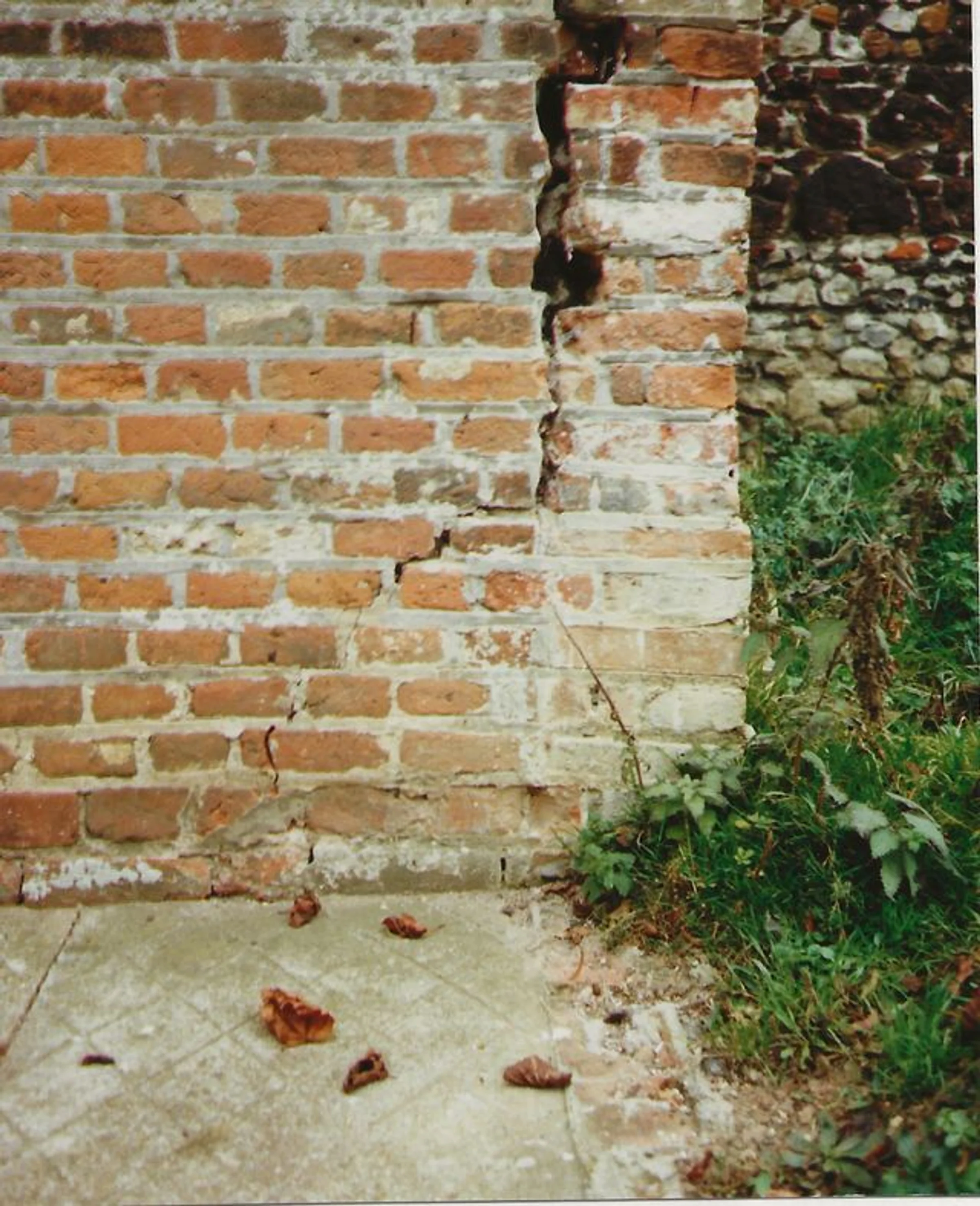 Photograph of a crack in the brickwork of the east wall of the porch, looking north. Unknown date.