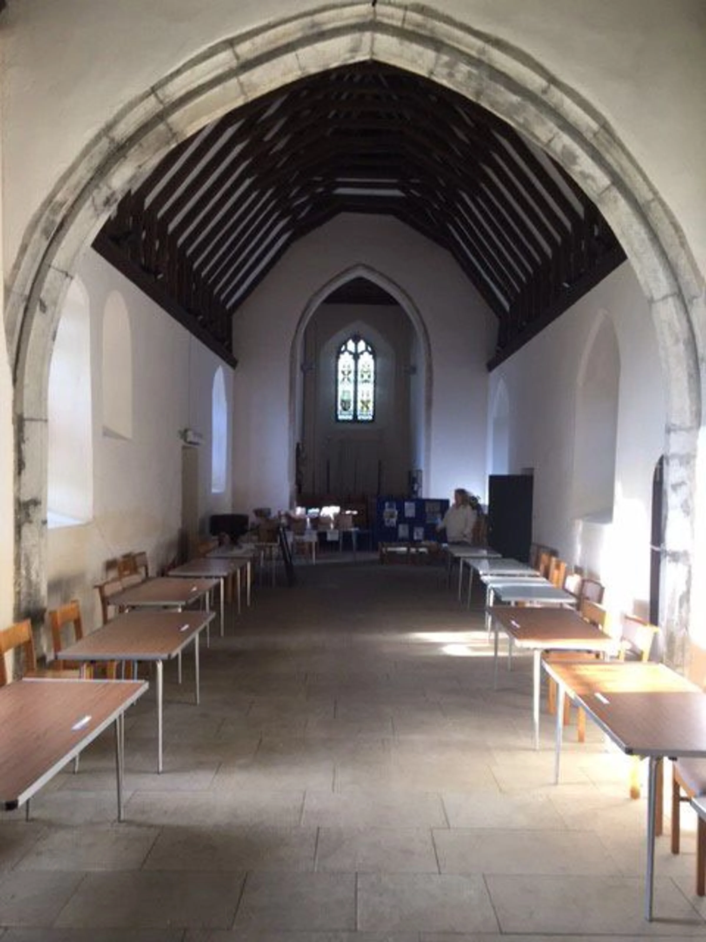 Photograph looking west down the chancel and nave set up for a craft fayre, 2022.