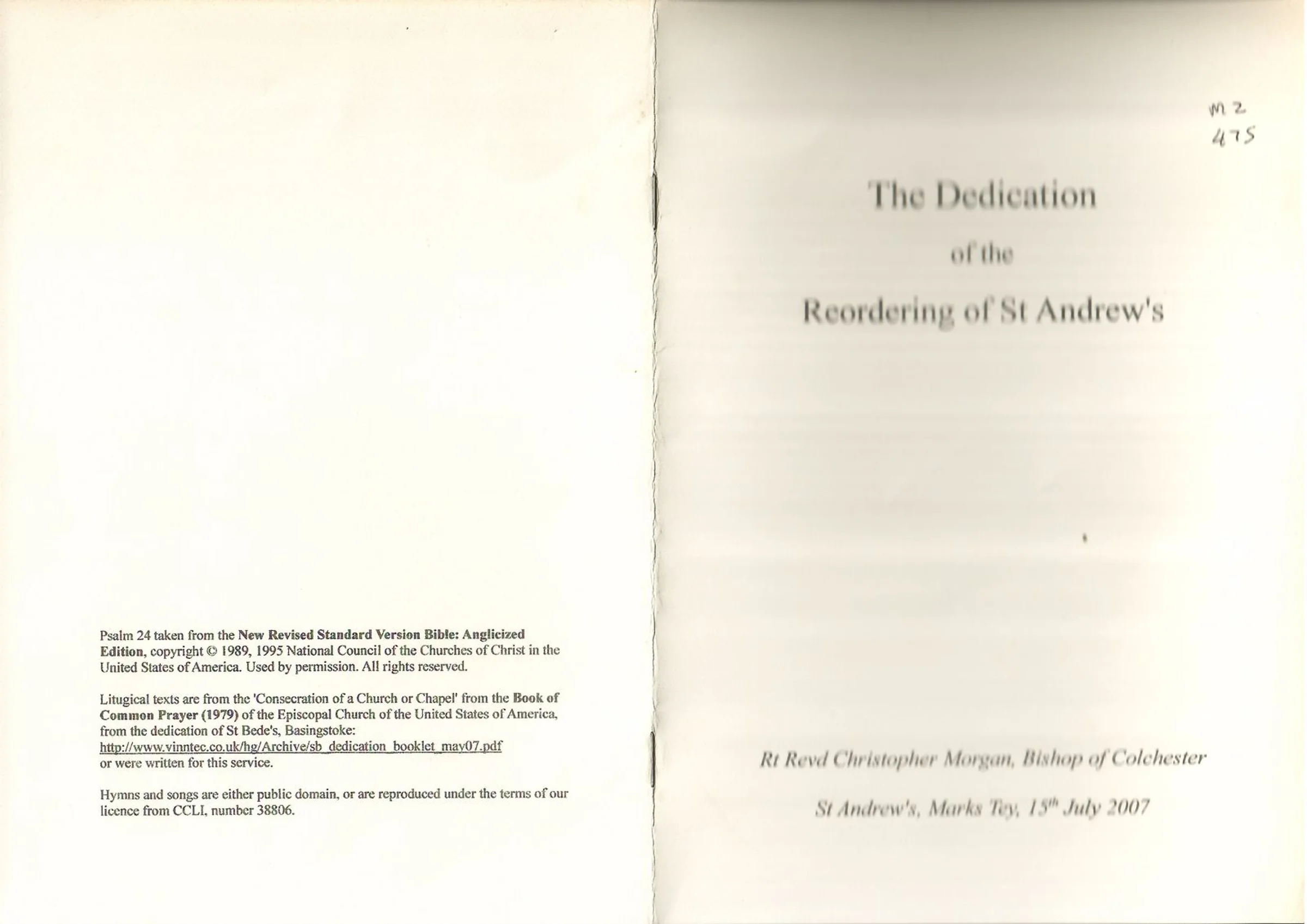 Cover of the service book for "The Dedication of the Reordering of St Andrew's" on 15th July 2007, with the Bishop of Colchester.