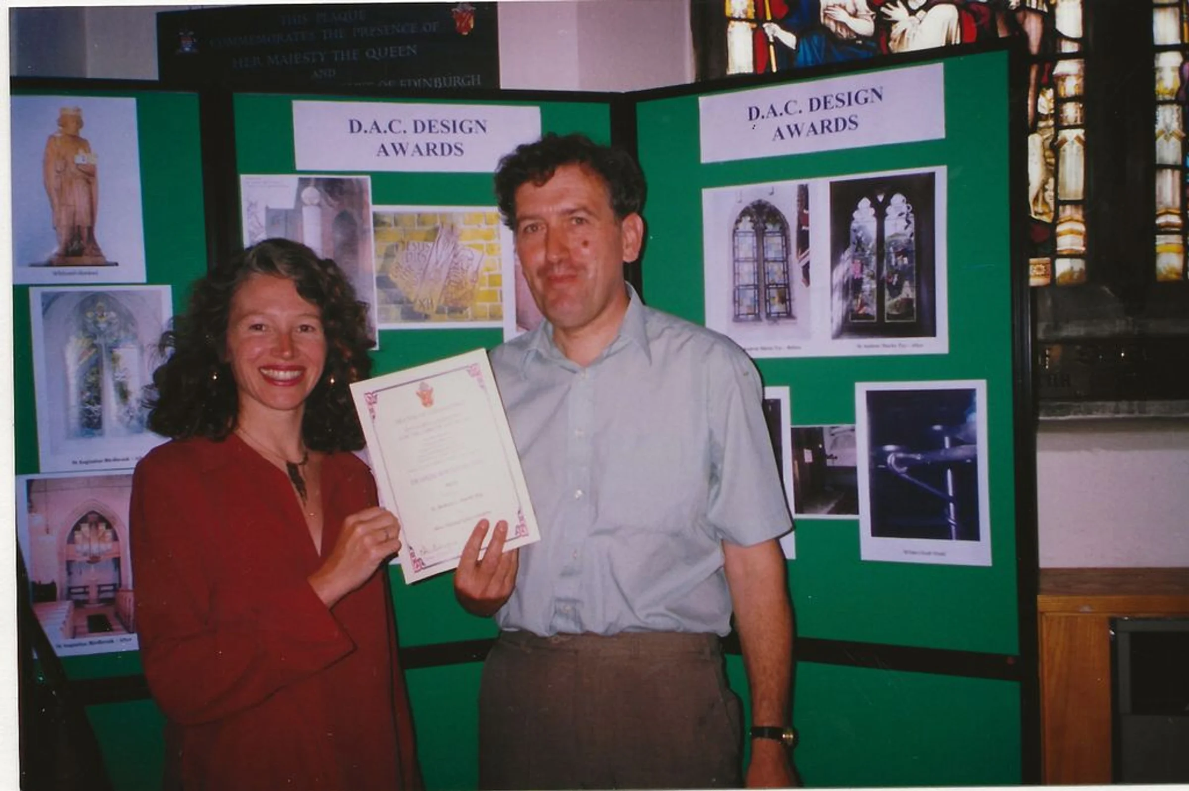 Photograph of Andrew Waters with Susan McCarthy the designer of the Millennium Window, at the Diocesan Advisory Committee design Awards, 2002.