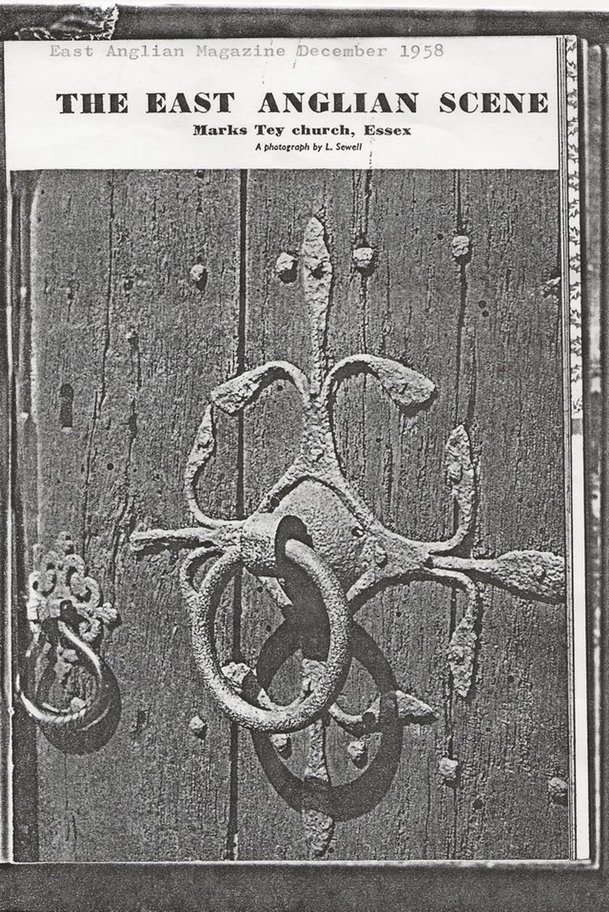 Cover of "The East Anglian Scene: Marks Tey church, Essex" showing a close up of the door knocker of St Andrew's Church. December 1958 edition.