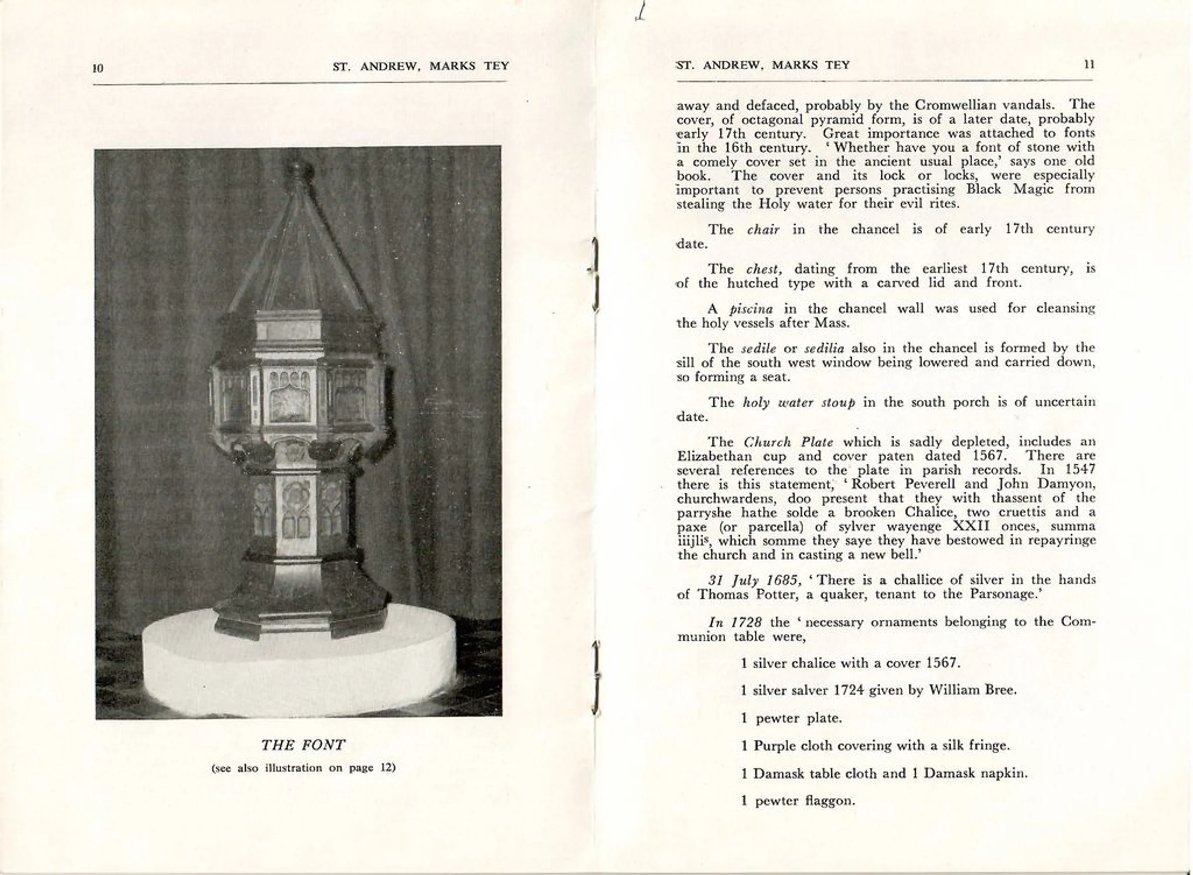 "A Short History of St Andrew's Church Marks Tey" by Edith Mason, p 7 of 12. Includes photograph of the wooden font.