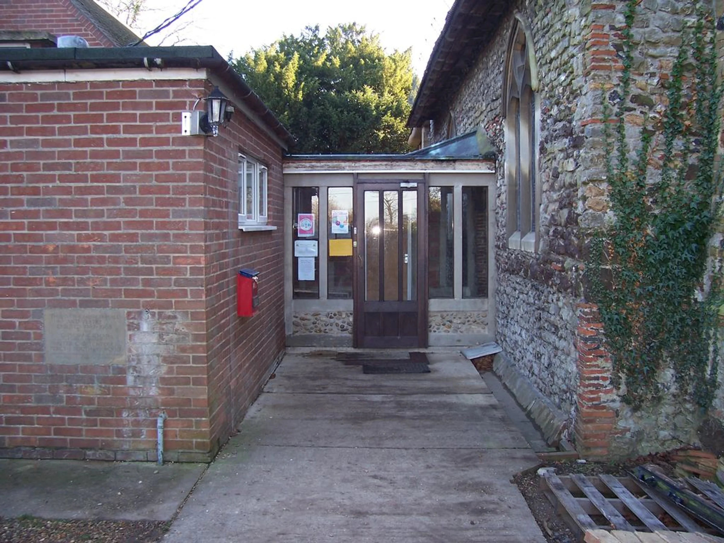 Photograph looking east of the entrance to the Church Hall and vestry, showing both the nave wall and Church Hall. Taken during the reordering.
