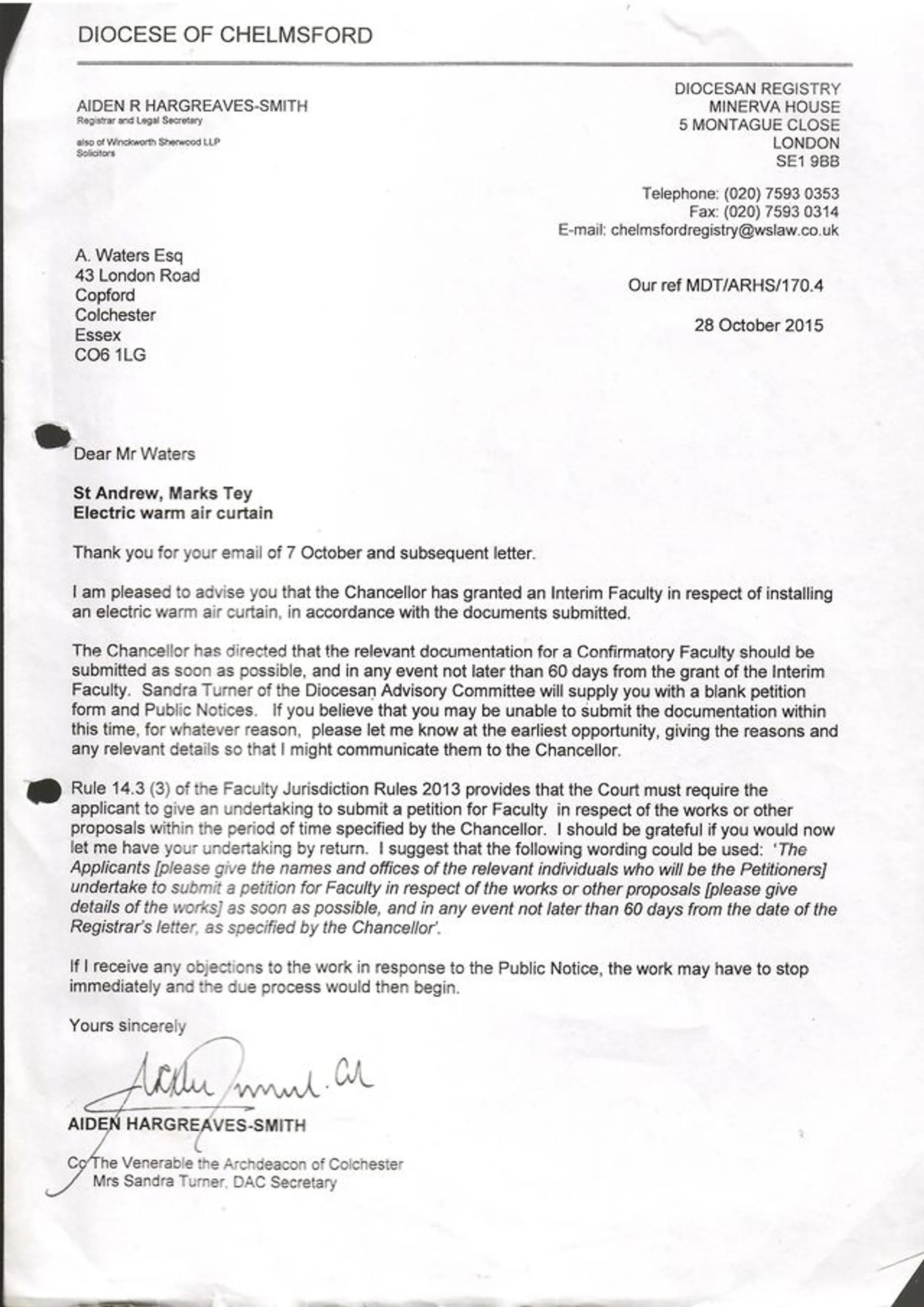 Letter from Diocese of Chelmsford regarding the granting of an interim faculty for the installation of an electric warm air curtain, dated 28th October 2015.
