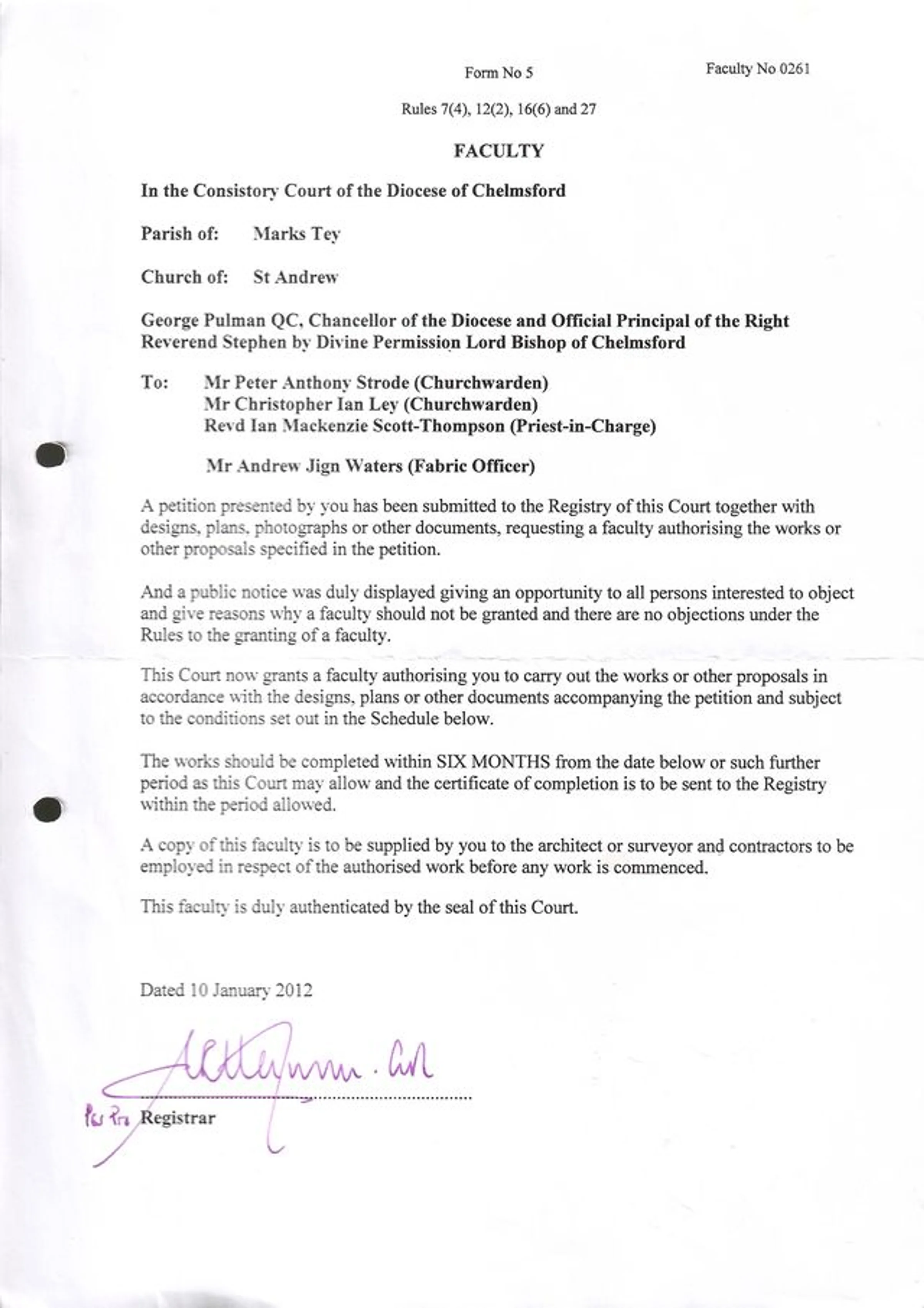 Faculty approval to replace stolen porch pamments, to Mr Peter Anthony Strode (Churchwarden), Mr Christopher Ian Ley (Churchwarden), Revd Ian Mackenzie Scott-Thompson (Priest-in-Charge) and Mr Andrew Jign Waters (Fabric Officer). In 2012.