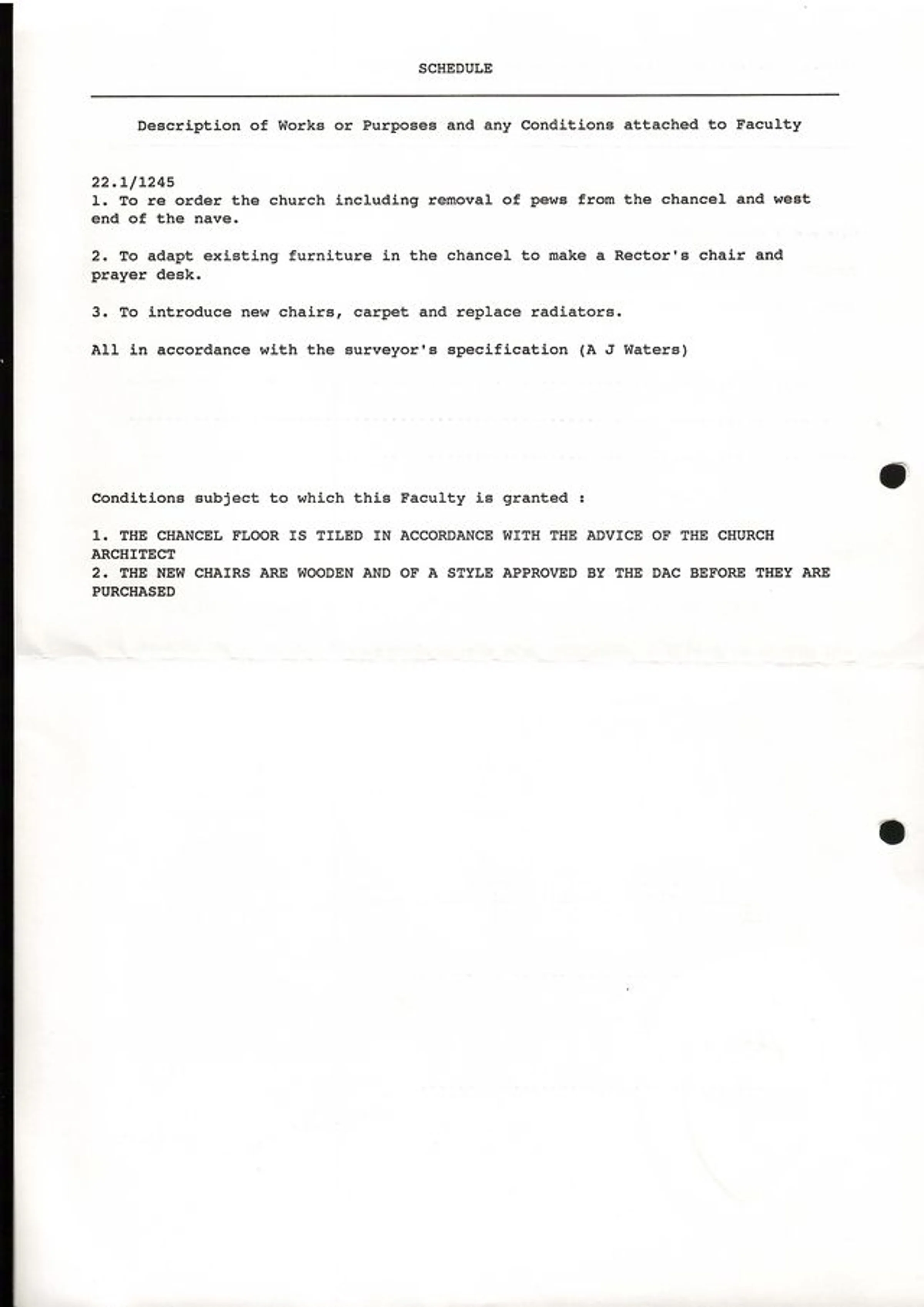 Schedule of works associated with the approved faculty, including removal of chancel pews and installation of some new furniture, 1996.