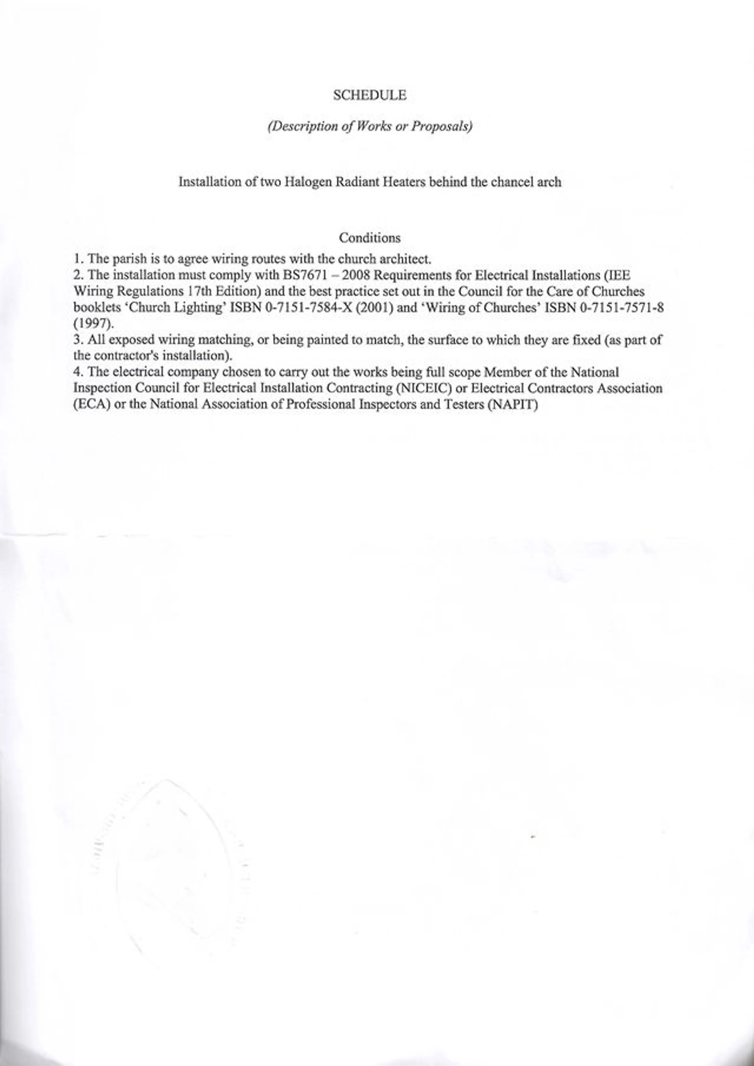 Schedule of works regarding the approved faculty for the installation of two halogen heaters in the chancel, dated 4th October 2024.
