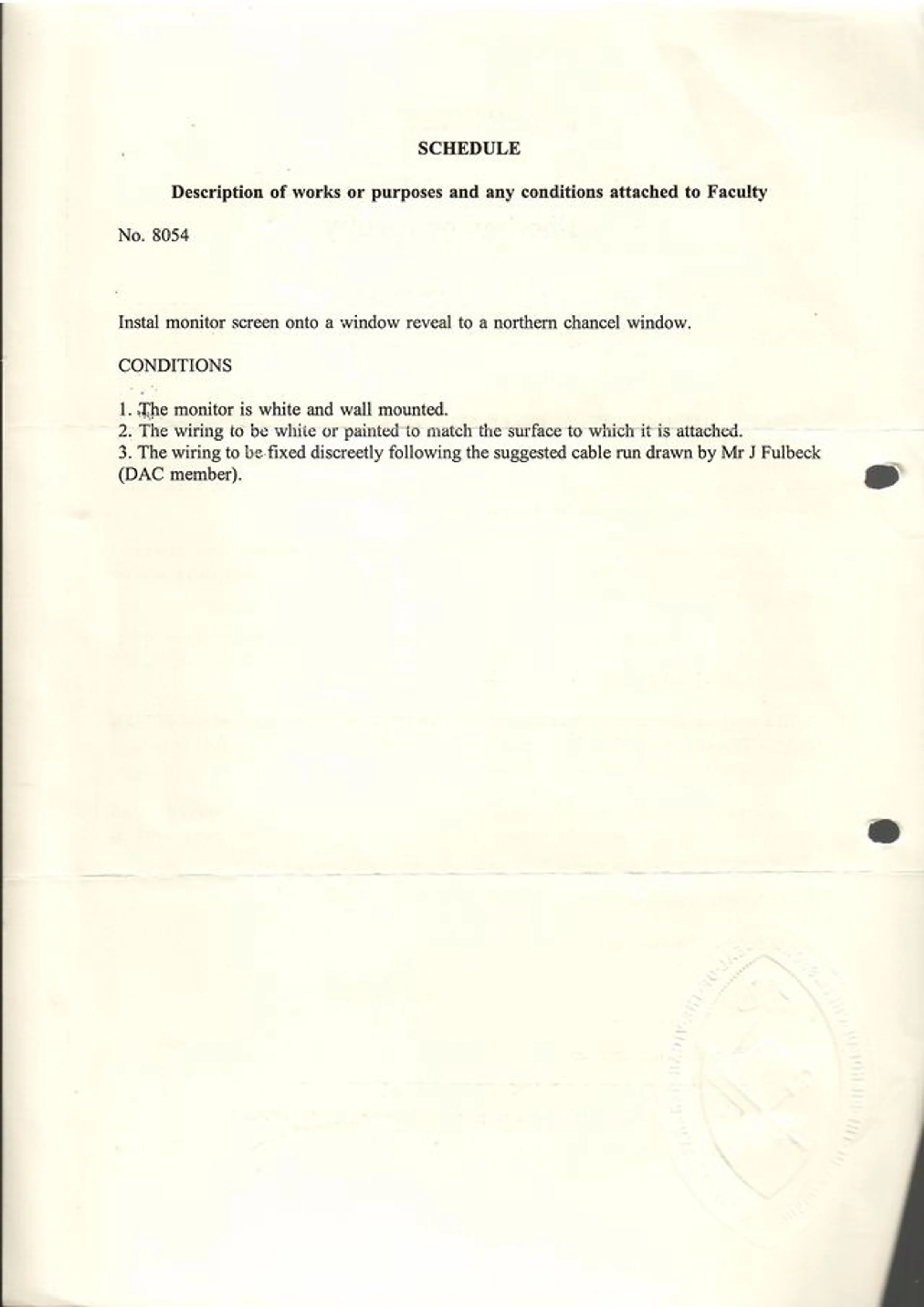 Schedule of works regarding the approved faculty for the installation of a monitor screen onto a window reveal in the chancel, in 2011.