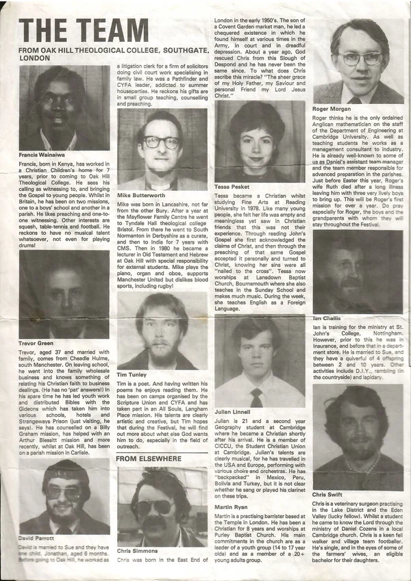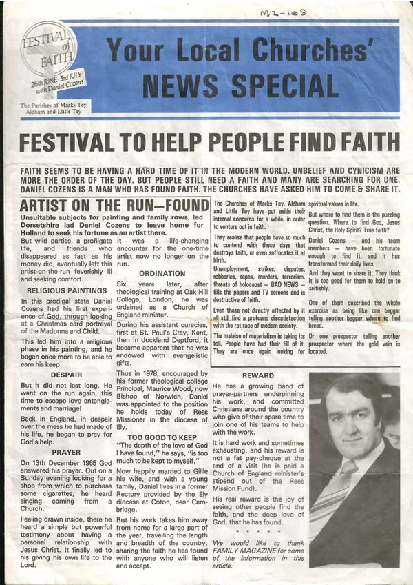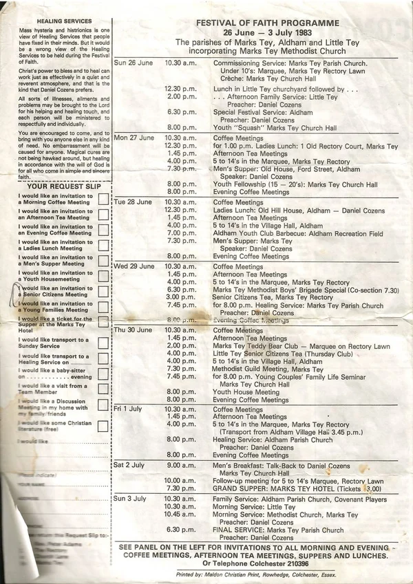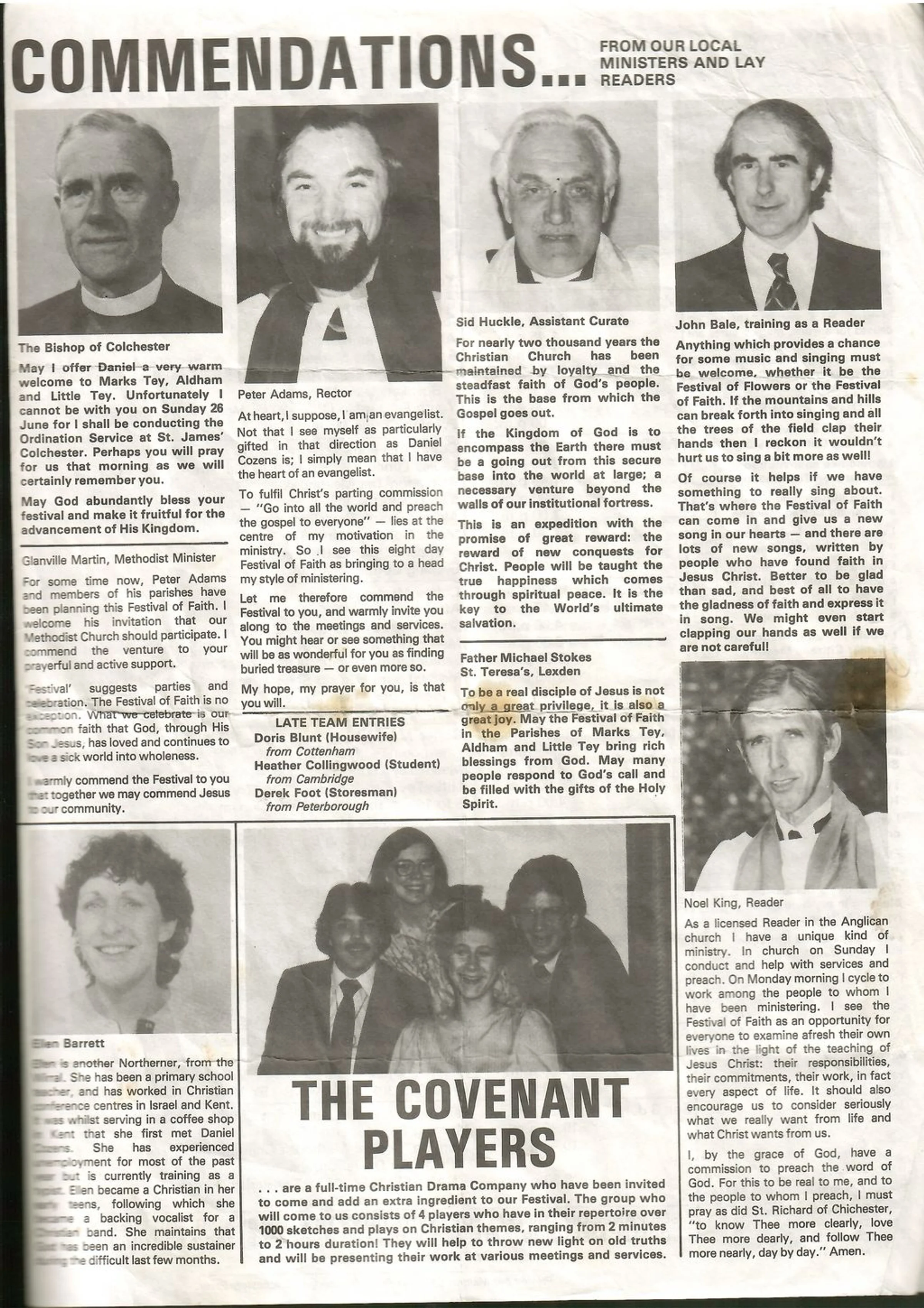"Commendations from our local ministers and lay readers" regarding the Festival of Faith with the Daniel Couzens Mission, June 1983. With words from The Bishop of Colchester, Peter Adams Rector, Sid Huckle assistant curate, John Bale trainee reader, Glanville Martin Methodist minister, Father Michael Stokes of St Teresa's Lexden and Noel King, reader. Page 3 of 4.