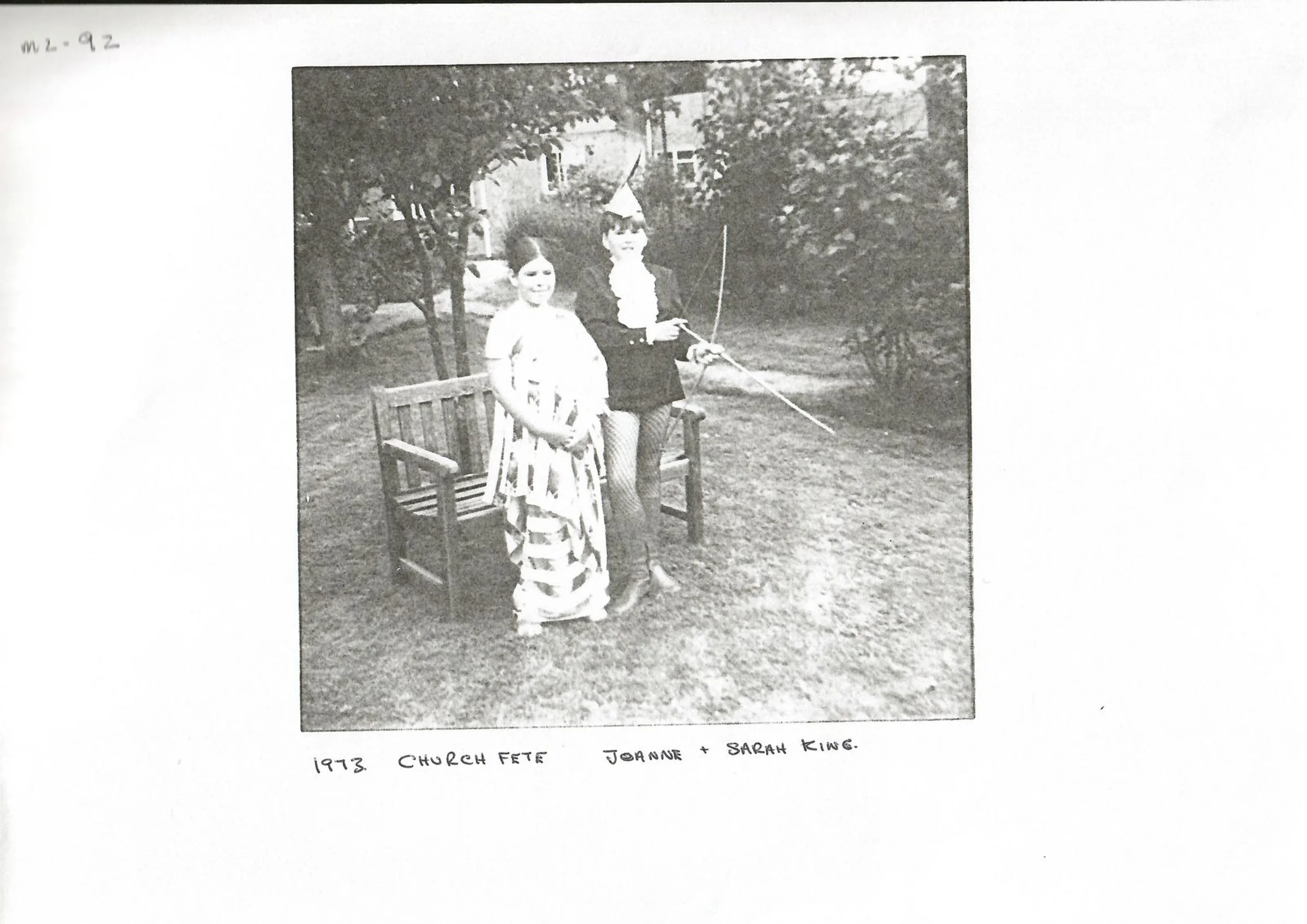 Black and white photograph of Joanne and Sarah King in costume at the St Andrew's Church fete, 1973.