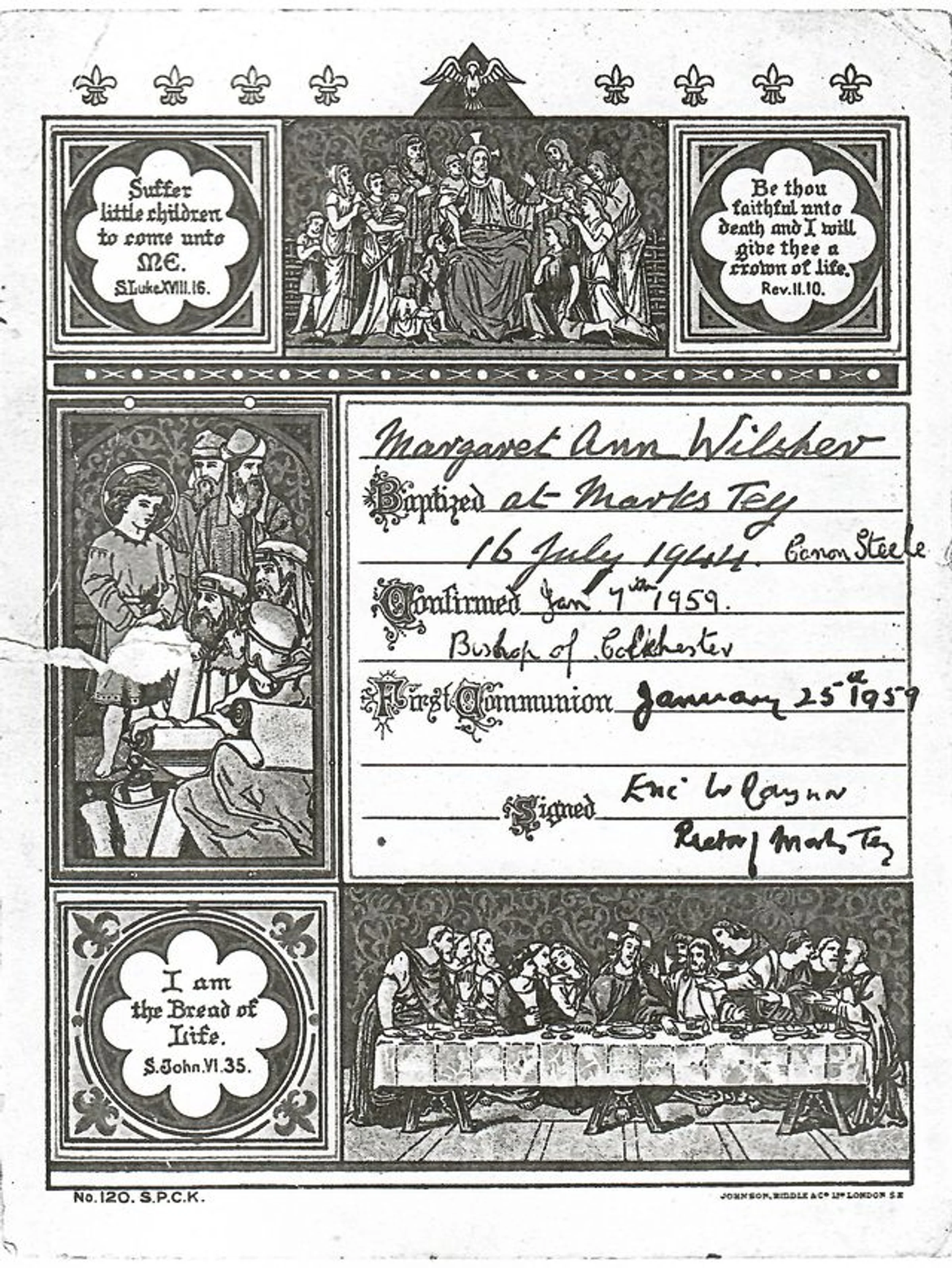 First communion certificate for Margaret Ann Wilsher, dated January 25th 1959, signed by Eric Raynor Rector of Marks Tey.