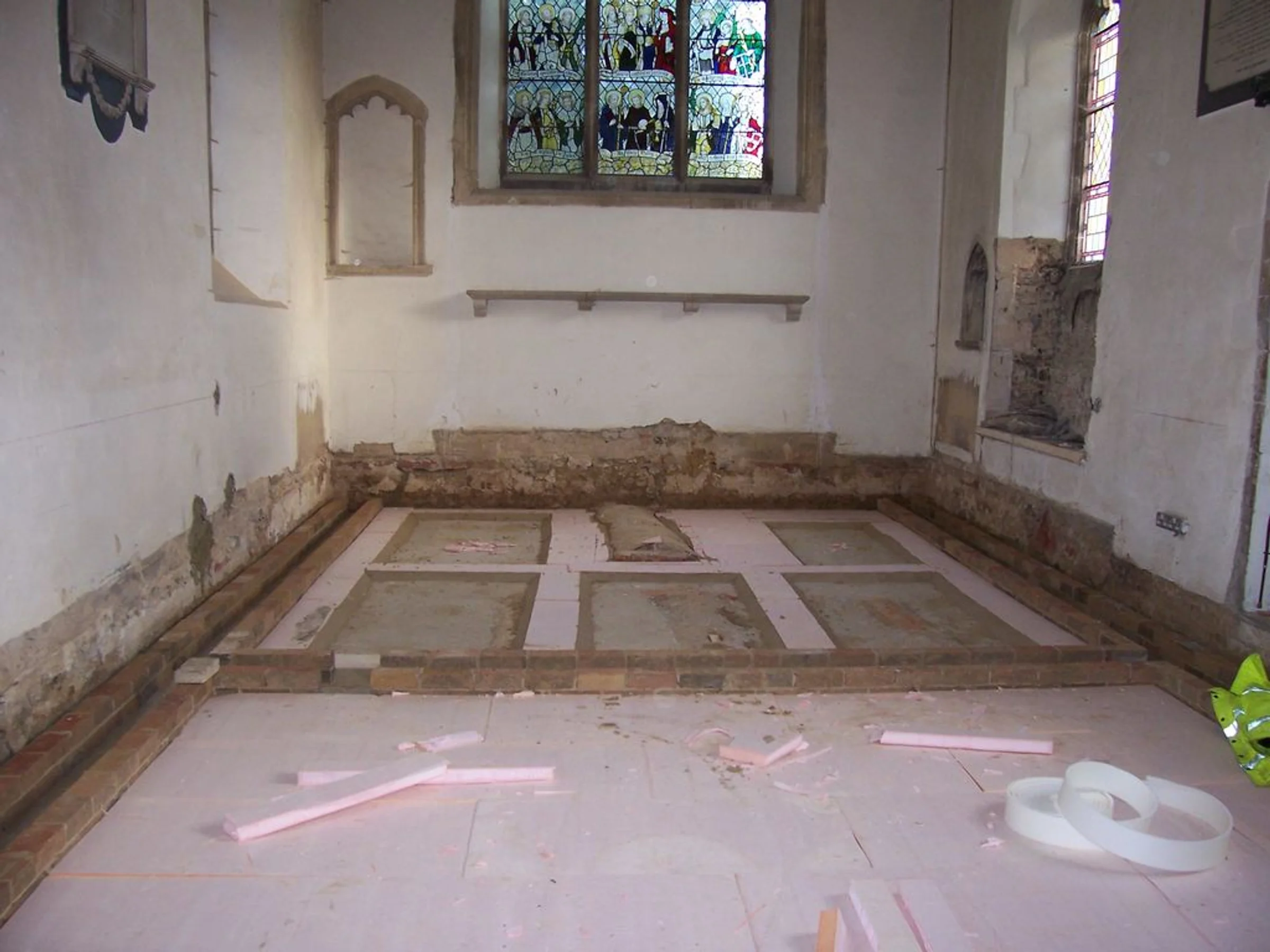 Photograph looking east of the levelling of the floor around the graves in the sanctuary prior to the installation of underfloor heating, during the 2007 reordering.