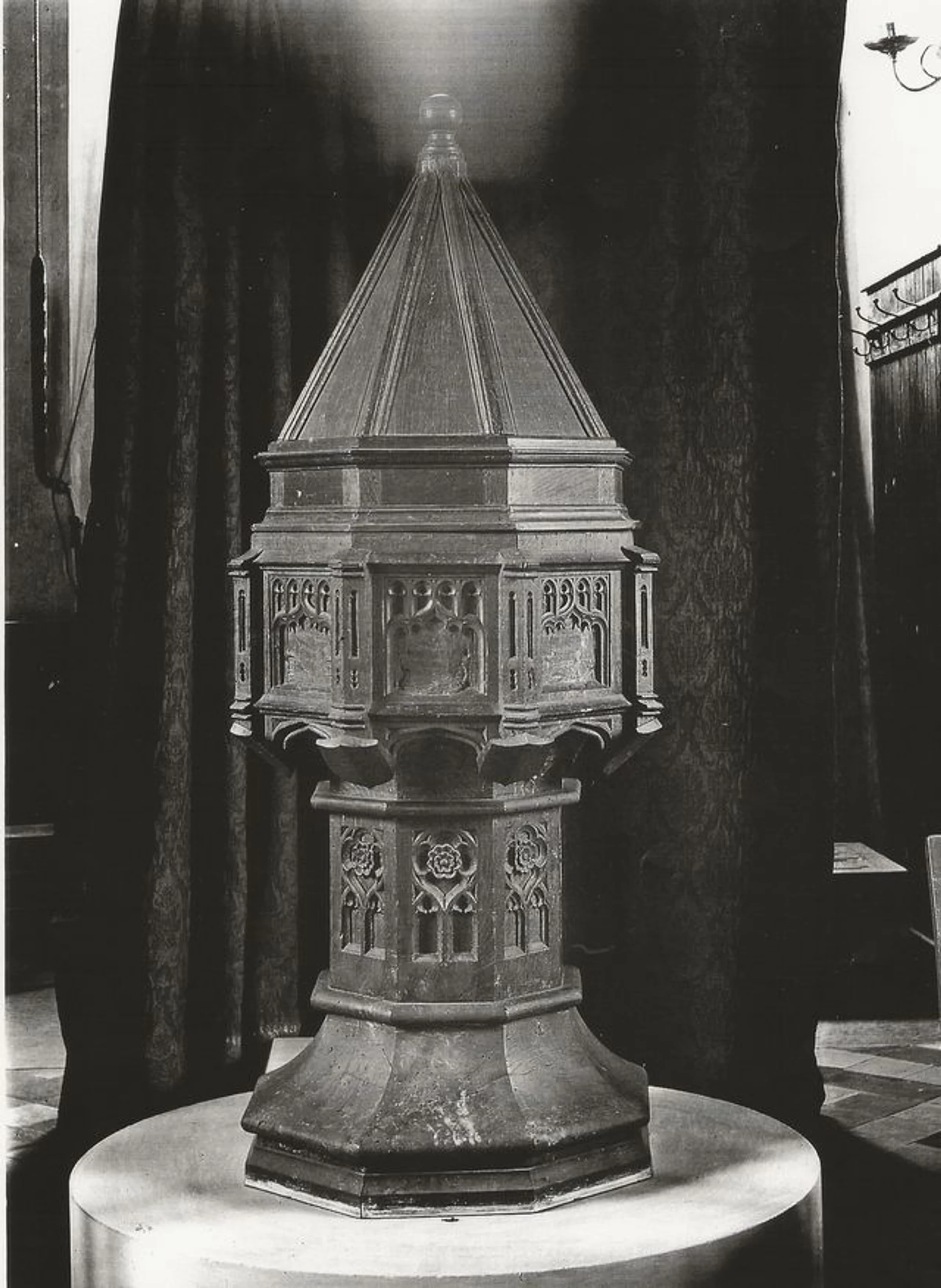 Published photograph or postcard in black and white of the wooden font with cover in St Andrew's Church.