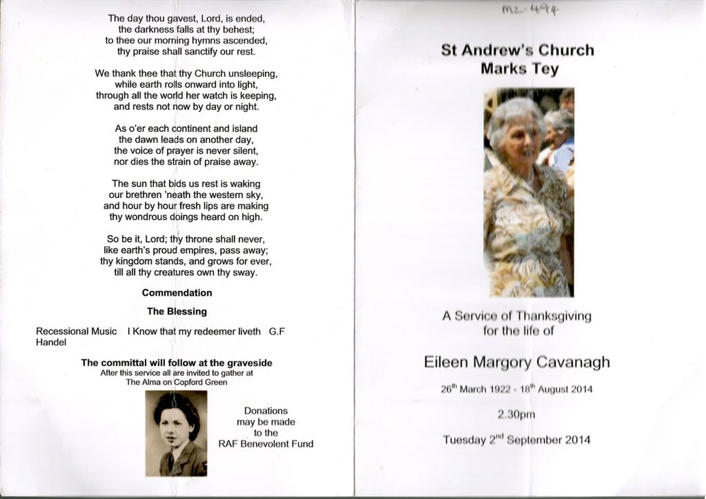 Service sheet from the funeral of Eileen Margory Cavanagh in St Andrew's Church, 26th March 2014.