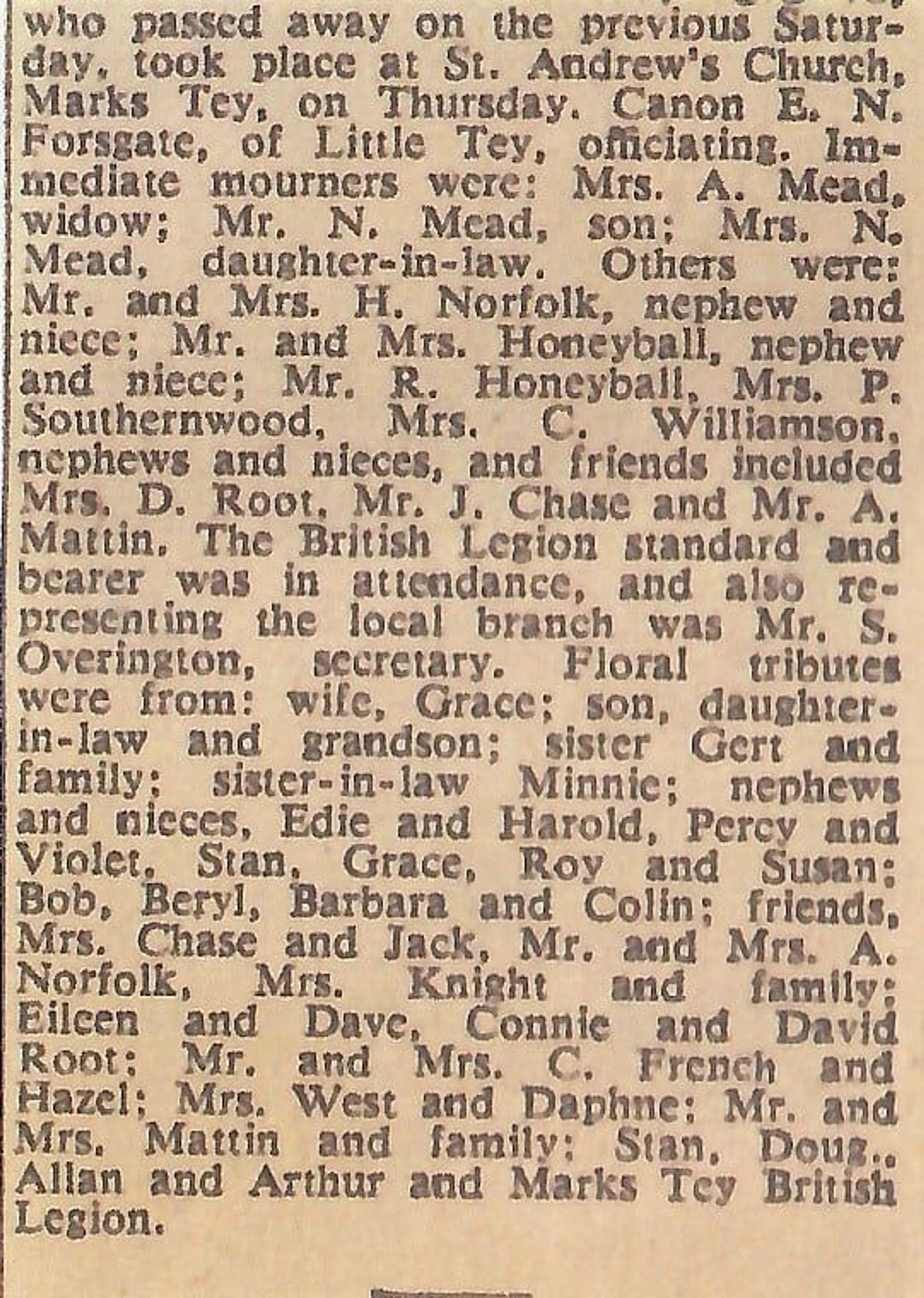 Newspaper report regarding the funeral of Arthur Mead at St Andrew's Church.